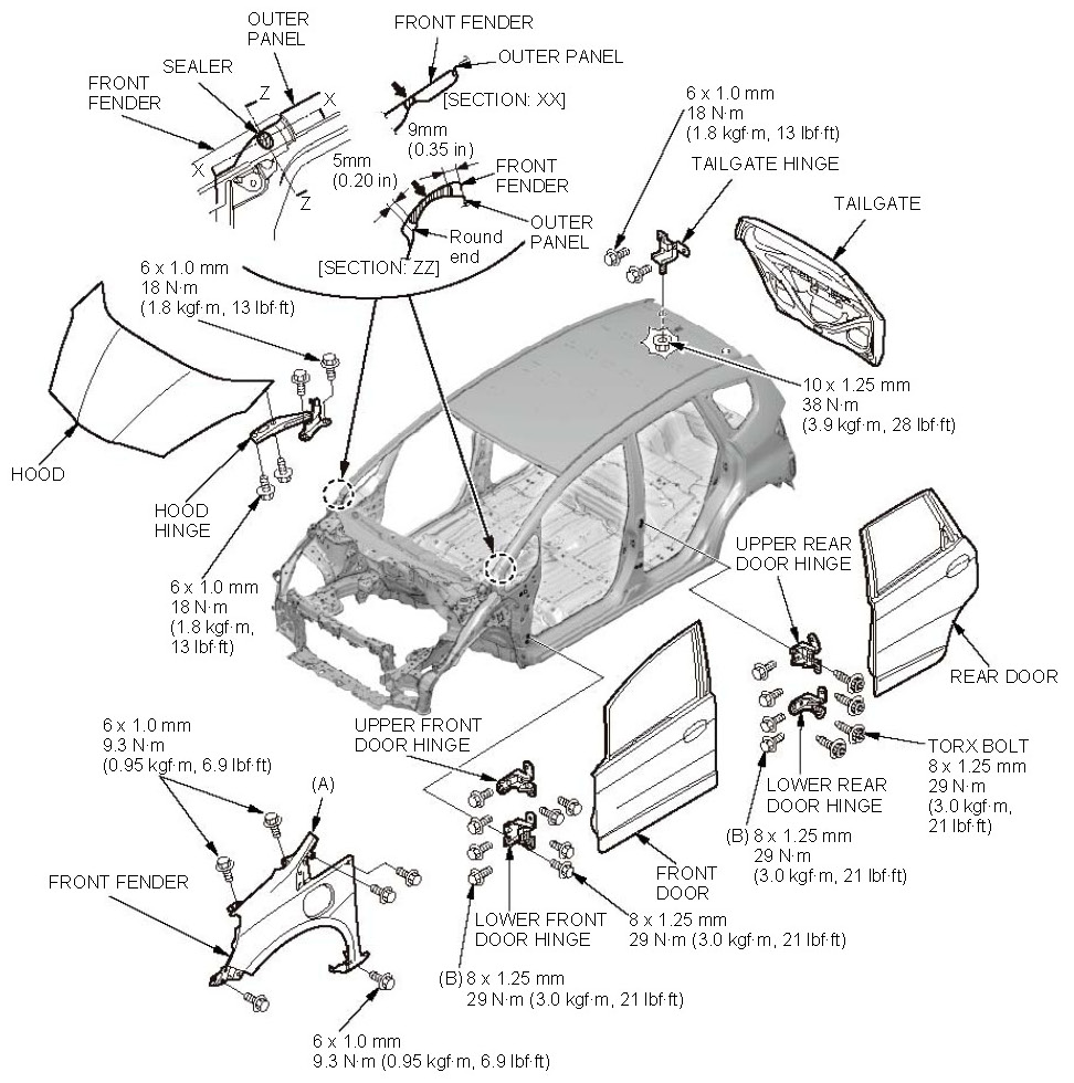 - Check the hood, the doors, and the tailgate positions; refer to the external parts fitting positions.