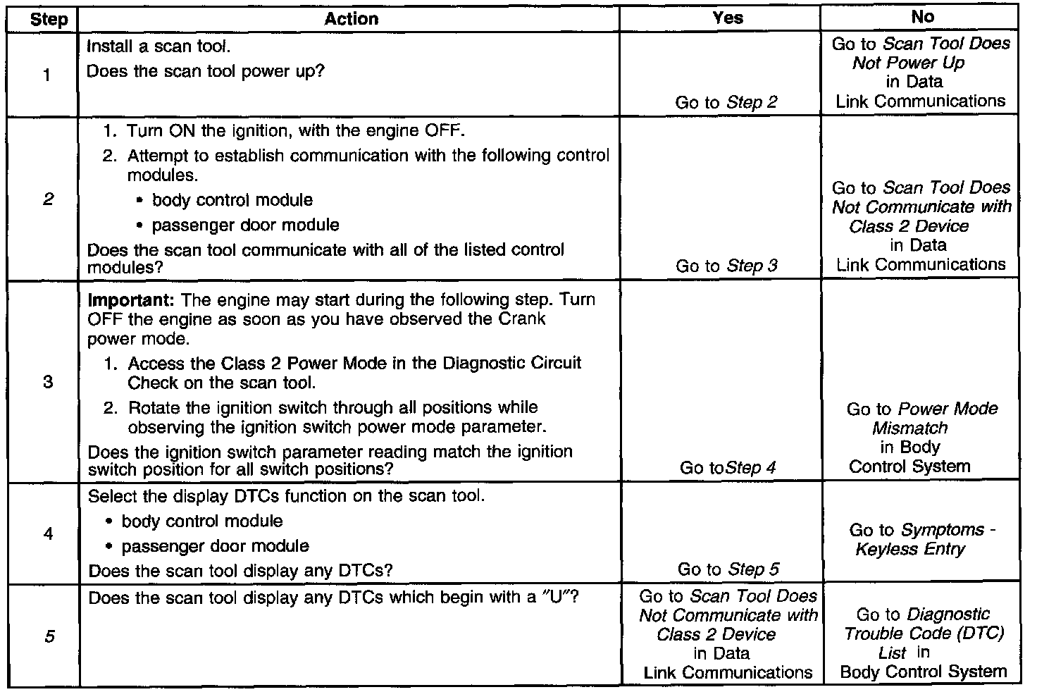 2. Lack of communication may be due to a partial malfunction of the class 2 serial data circuit or due to a total malfunction of the class 2 serial data circuit. The specified procedure will determine the particular condition.