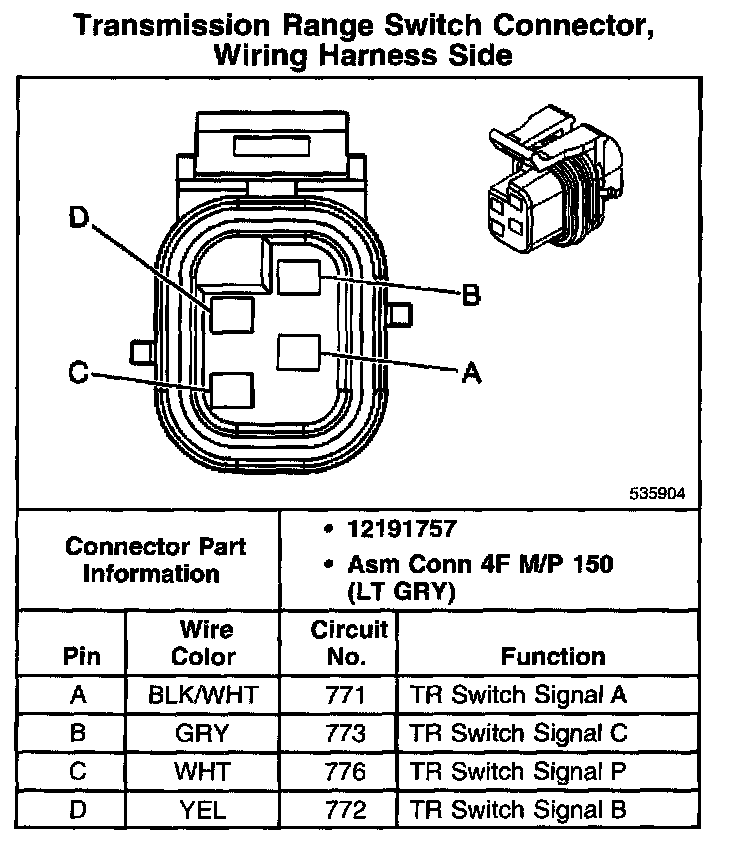 Transmission Range Switch Connector, Wiring Harness Side: