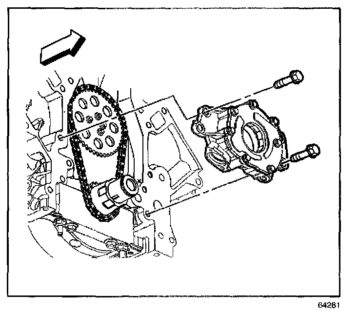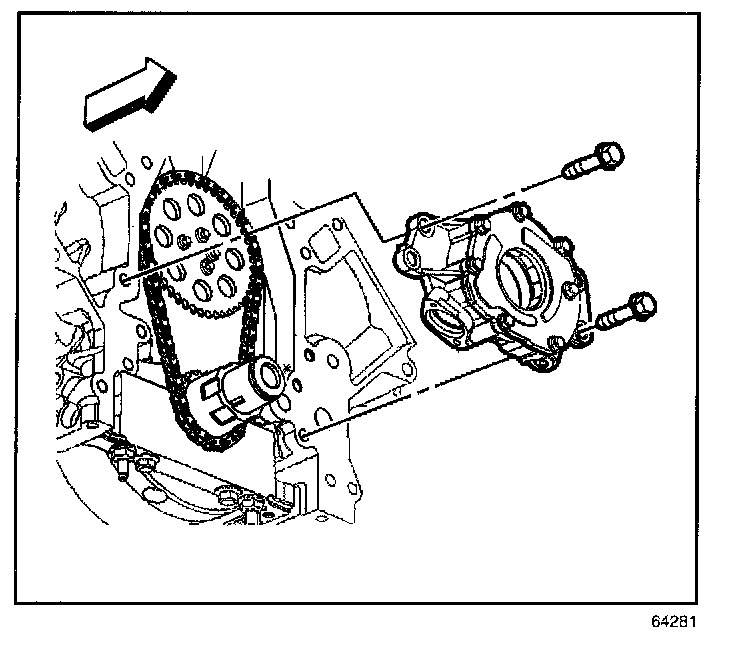 2. Install the oil pump onto the crankshaft sprocket until the pump housing contacts the face of the engine block.