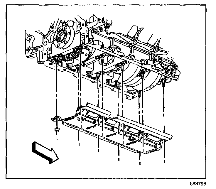 7. Align the oil pump screen mounting brackets with the correct crankshaft bearing cap studs.