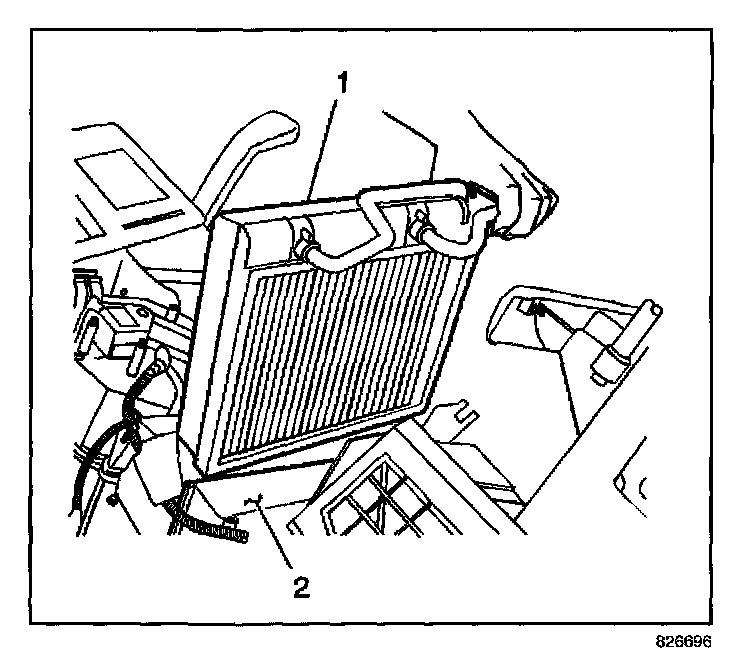 1. Install the evaporator core (1) to the HVAC module (2).