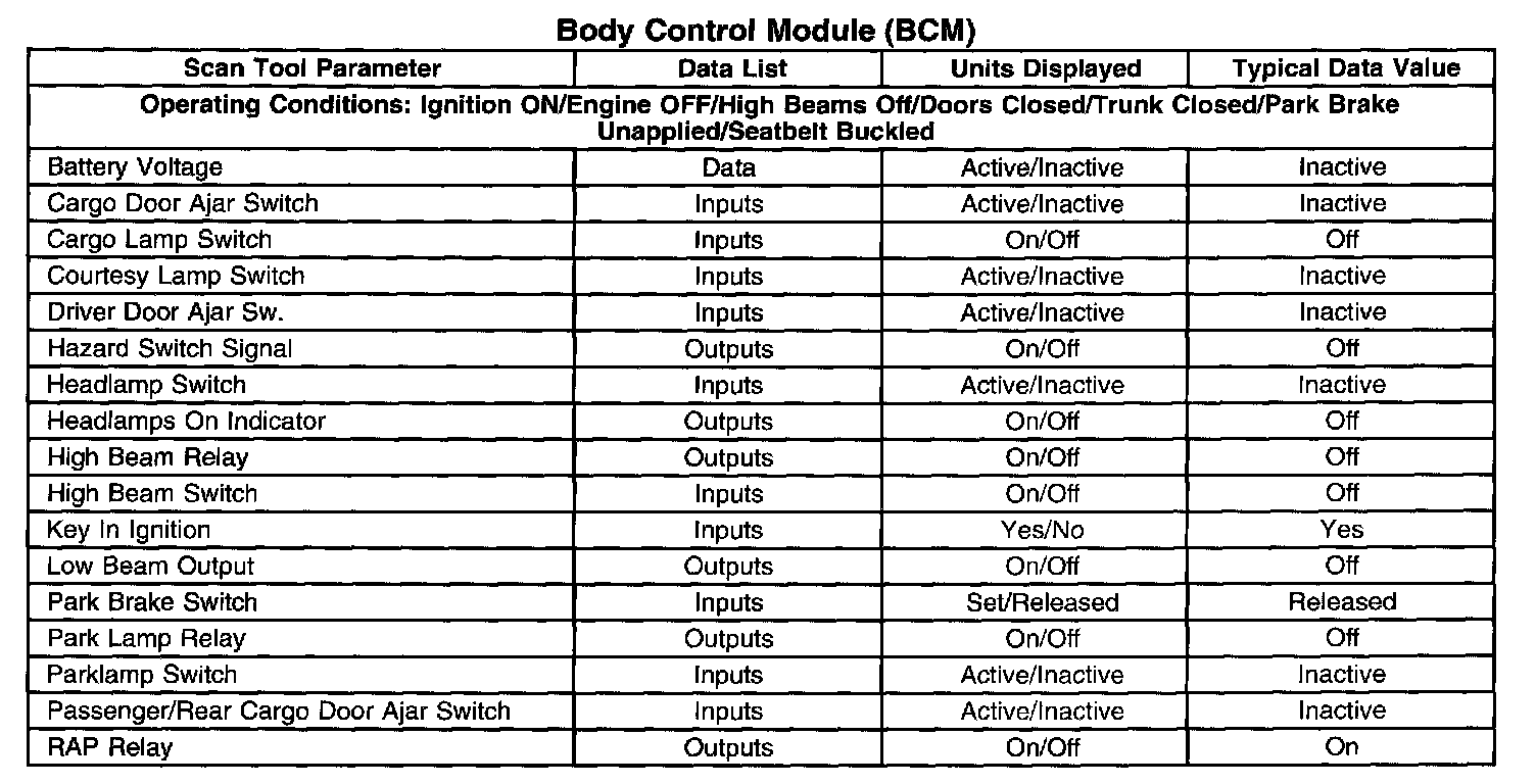 SCAN TOOL DATA LISTScan Tool Data List - Body Control Module (BCM):