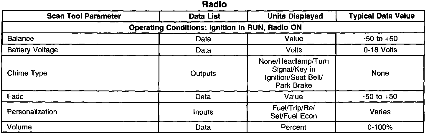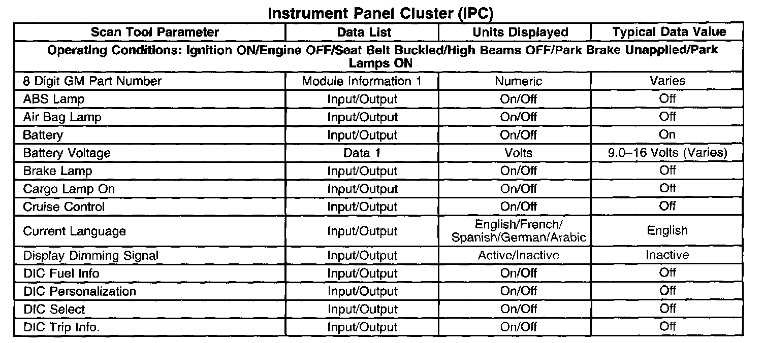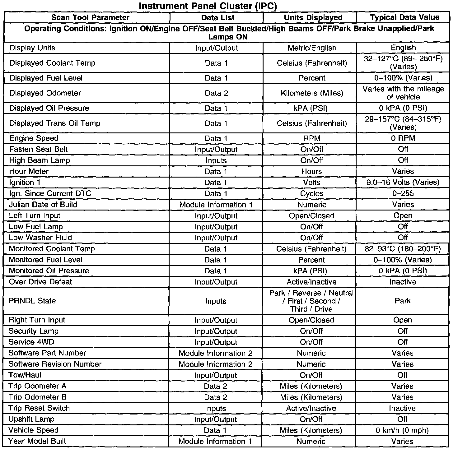 Use the scan tool data list(s) as directed by a diagnostic table or in order to supplement the diagnostic procedures. Begin all of the diagnostic procedures with Diagnostic System Check - Instrument Cluster, Diagnostic System Check - Driver Information Systems or Diagnostic System Check - Audible Warnings