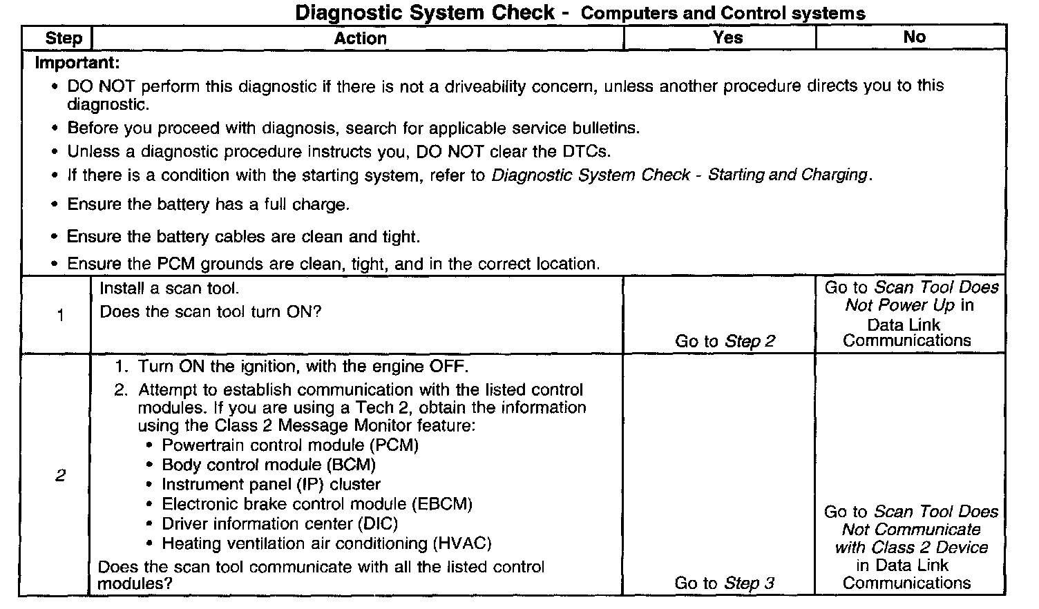 2. Lack of communication may be because of a partial or a total malfunction of the class 2 serial data circuit. The specified procedure determines the particular condition.