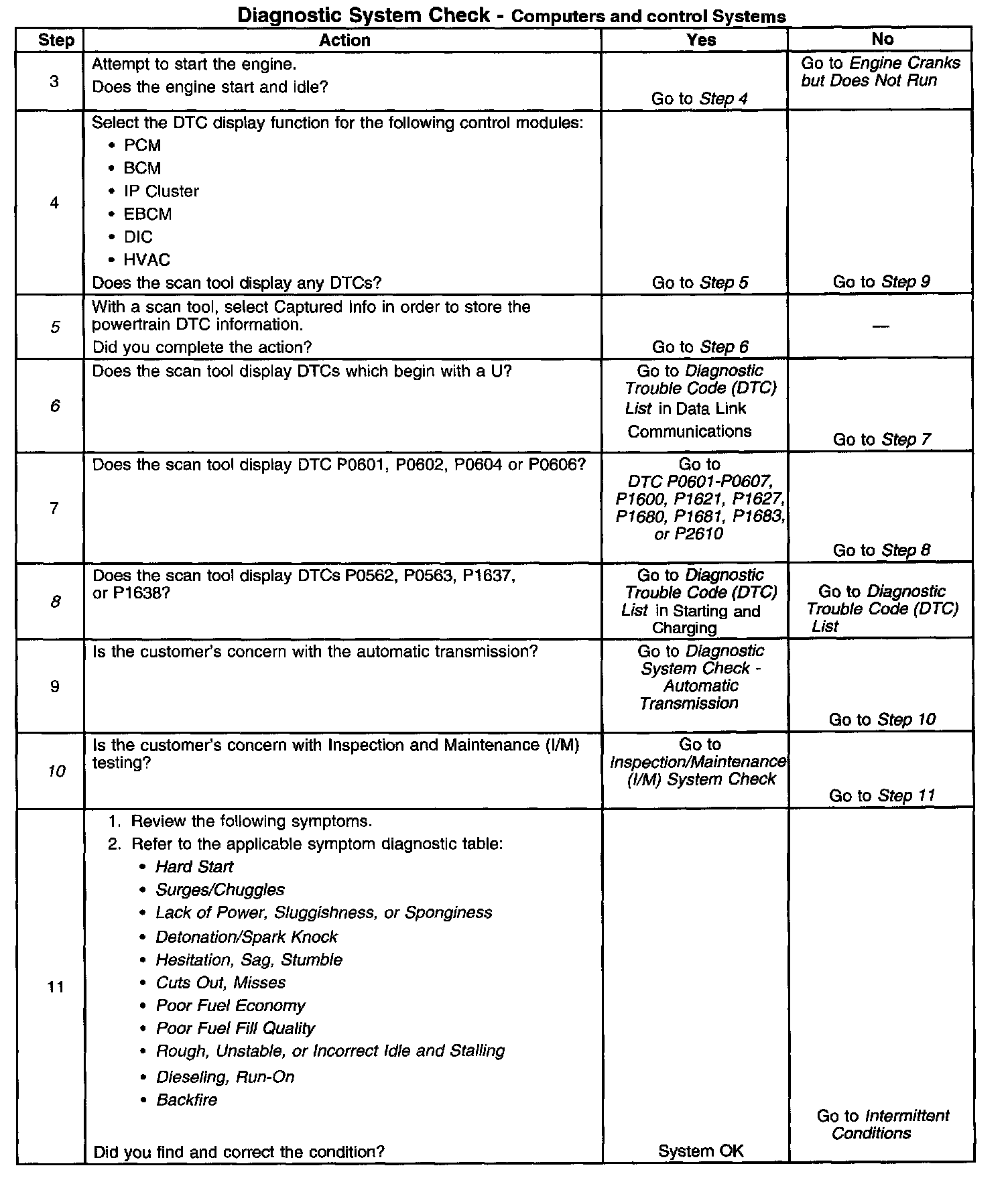 The Diagnostic System Check-Computers and Control Systems is an organized approach to identifying a condition that is created by a malfunction in the engine control system. The Diagnostic System Check must be the starting point for any driveability concern. The Diagnostic System Check directs the service technician to the next logical step in order to diagnose the concern. Understanding and correctly using the diagnostic table reduces diagnostic time and prevents the replacement of good parts.
