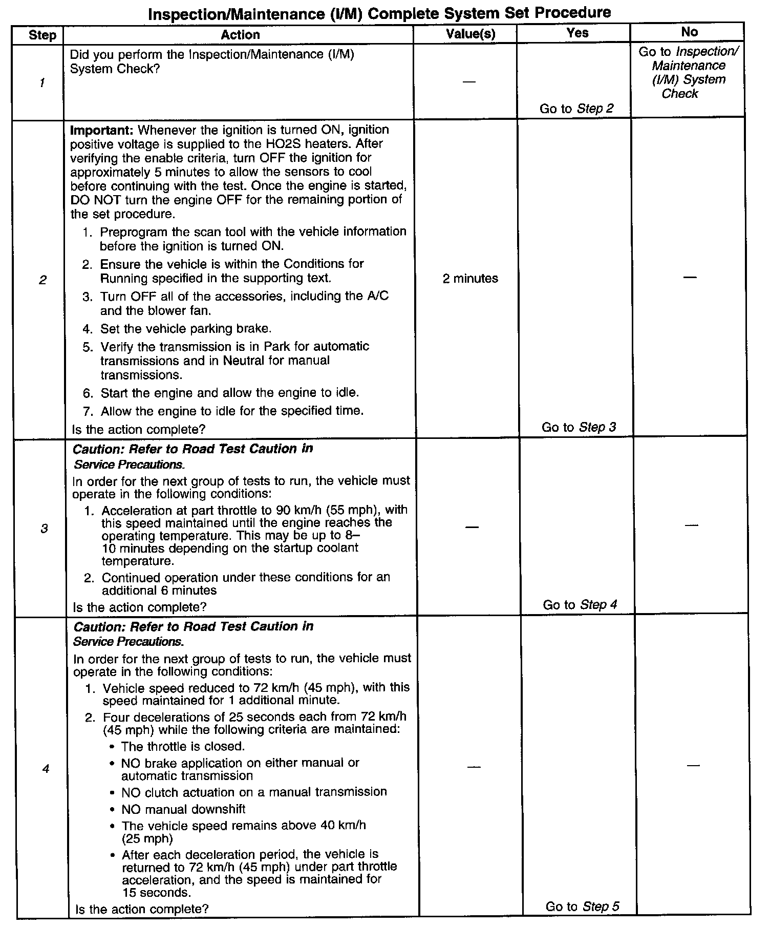 The purpose of the I/M Complete System Set Procedure is to satisfy the enable criteria necessary in order to execute all of the I/M readiness diagnostics, and to complete the trips for those particular diagnostics. When all diagnostic tests are completed, the I/M System Status indicators are set to YES. Perform this test when more than one or all of the I/M System Status indicators are set to NO.