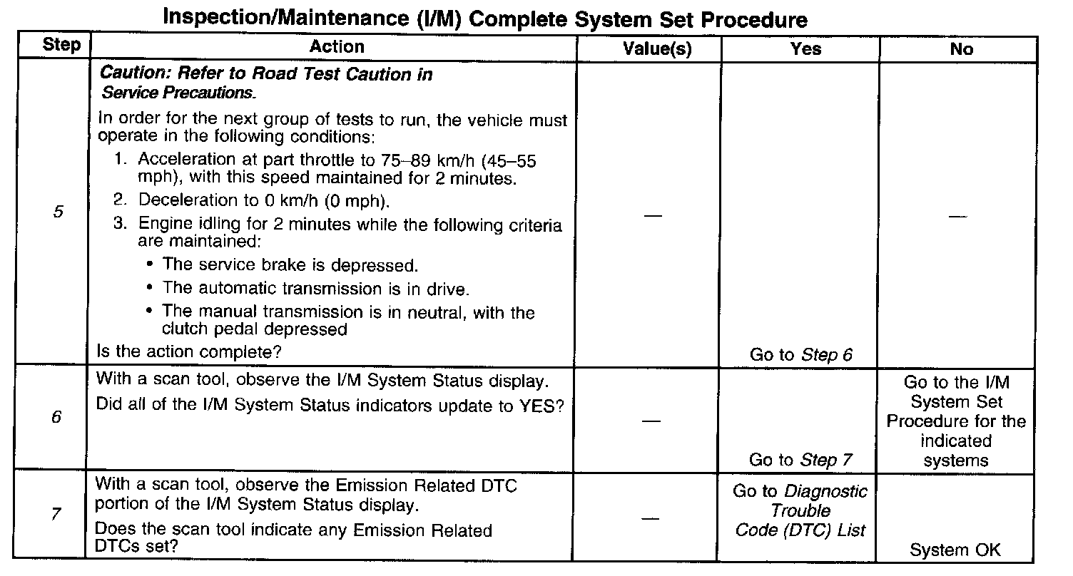 7. The I/M System Status only reports on whether a diagnostic has run, not the outcome of the test. If any emission-related DTC sets after the tests are complete, the DTC will require diagnosis.