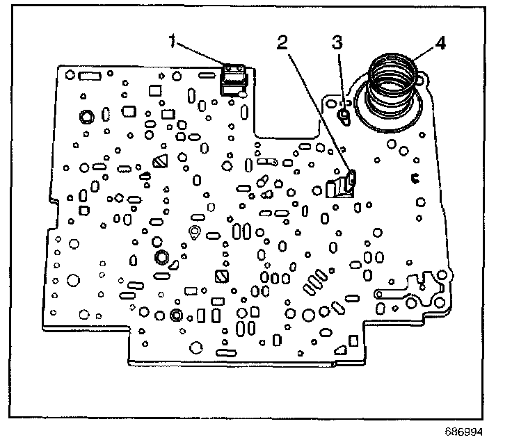 8. Place the 3-4 accumulator spring (4) on the spacer plate.