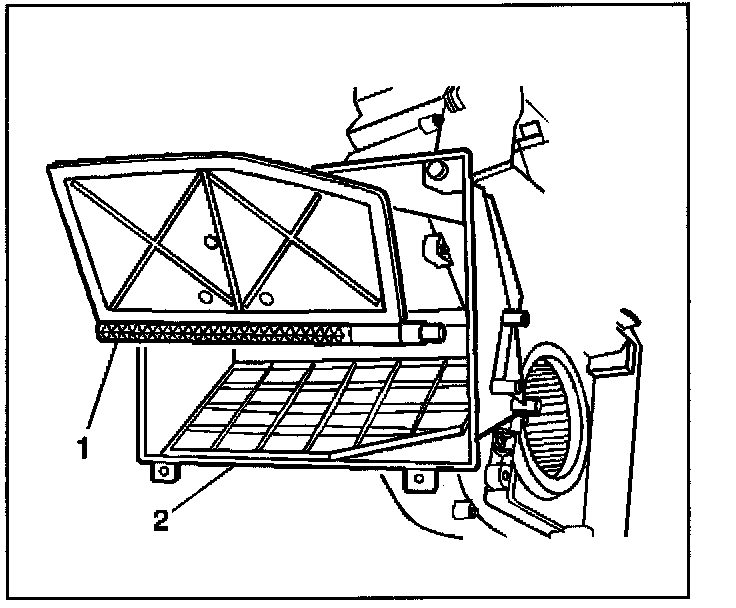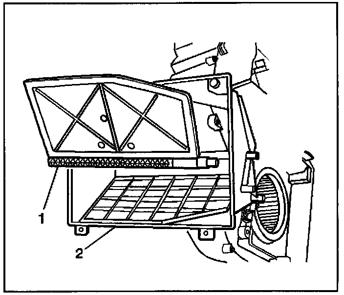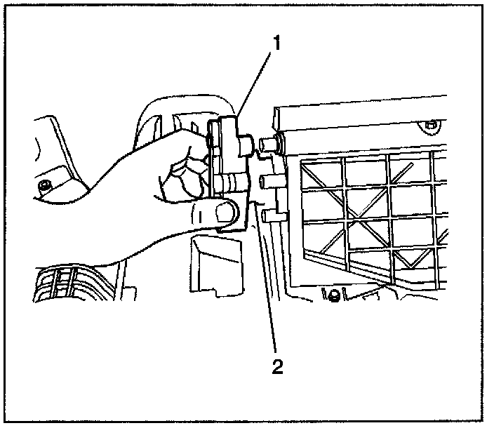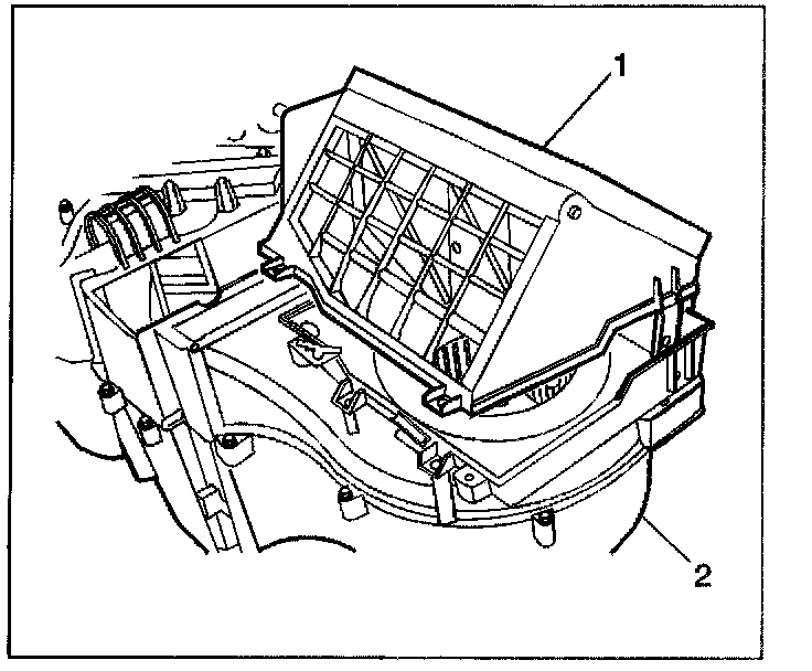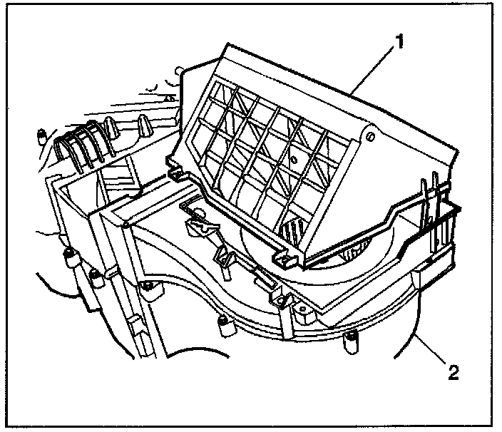 4. Remove the upper recirculation housing (1) from the HVAC module assembly (2).