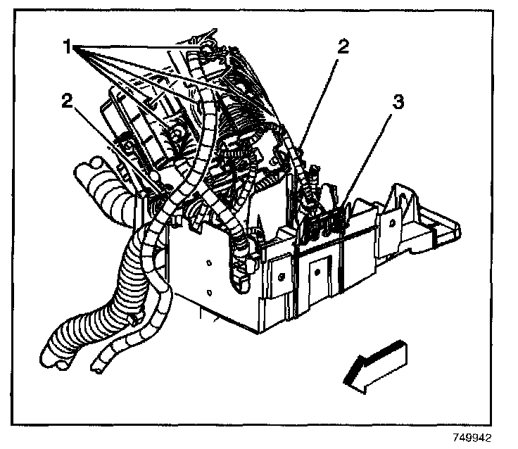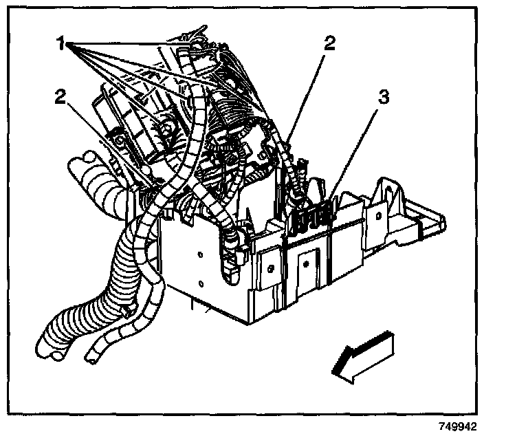 9. To replace the engine electrical center bracket remove the 4 retaining bolts (1).