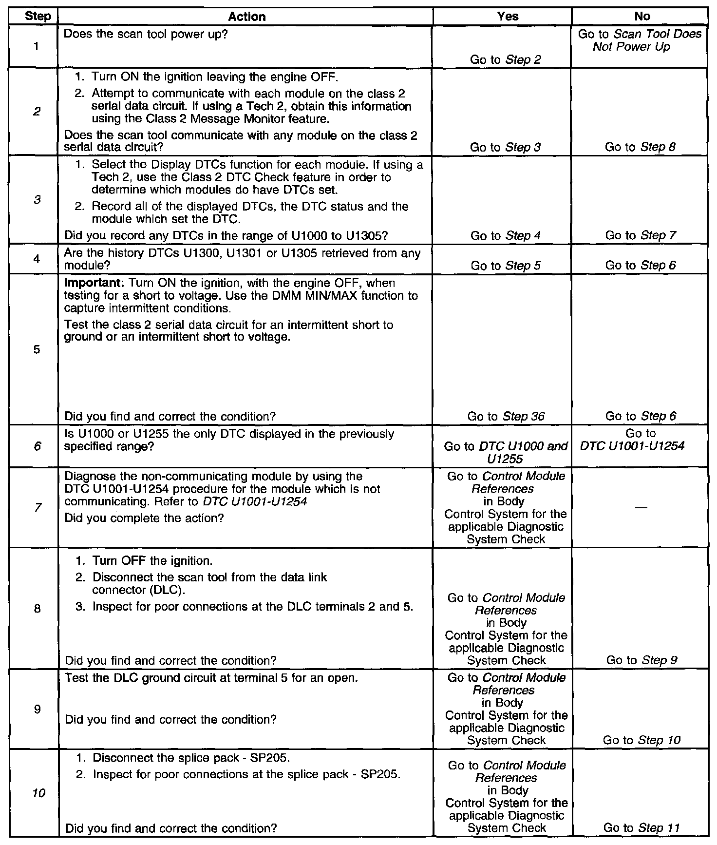 11. An open in the class 2 serial data circuit between the DLC and splice pack - SP205 will prevent the scan tool from communicating with any module. This condition will not set a DTC.