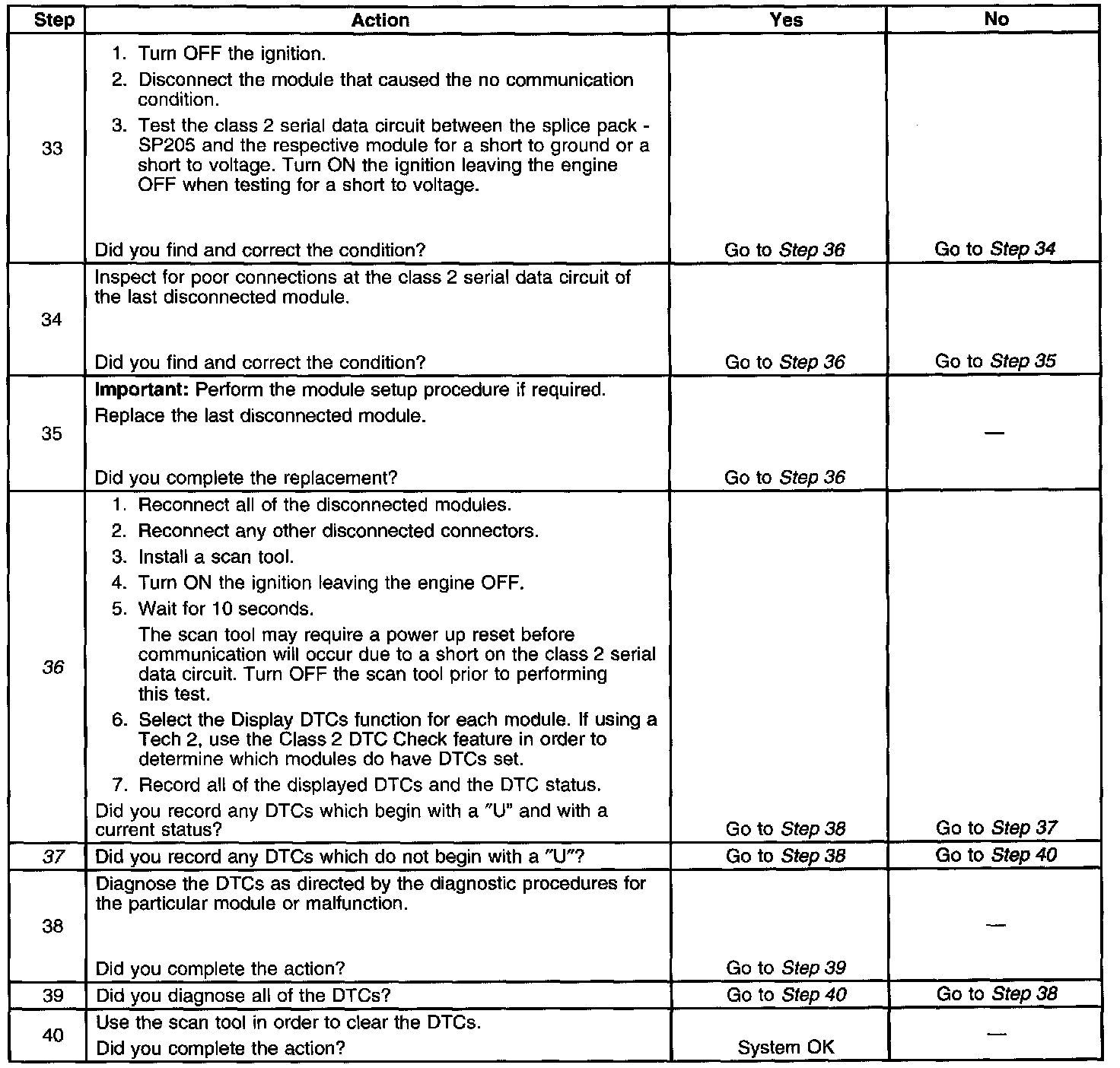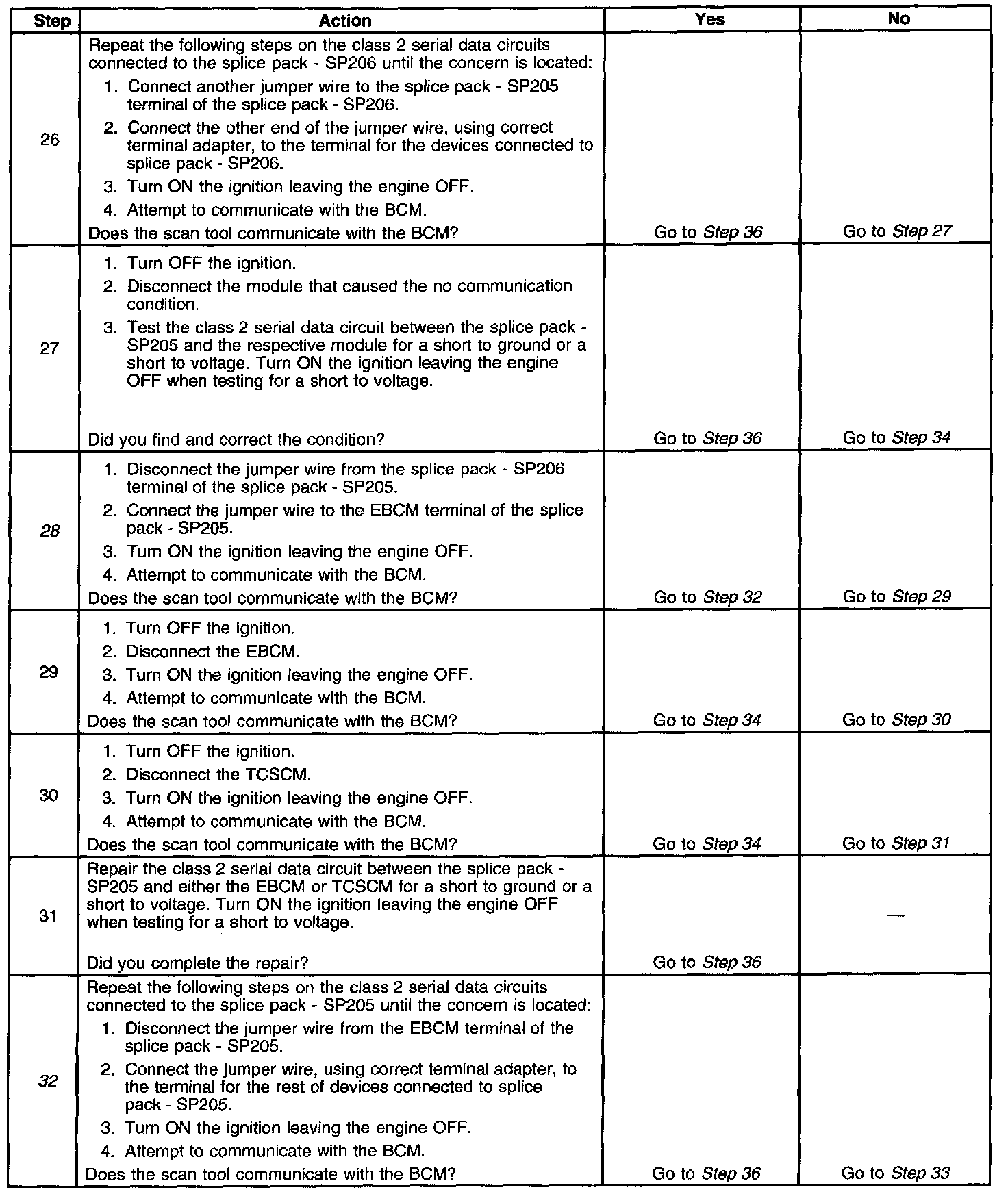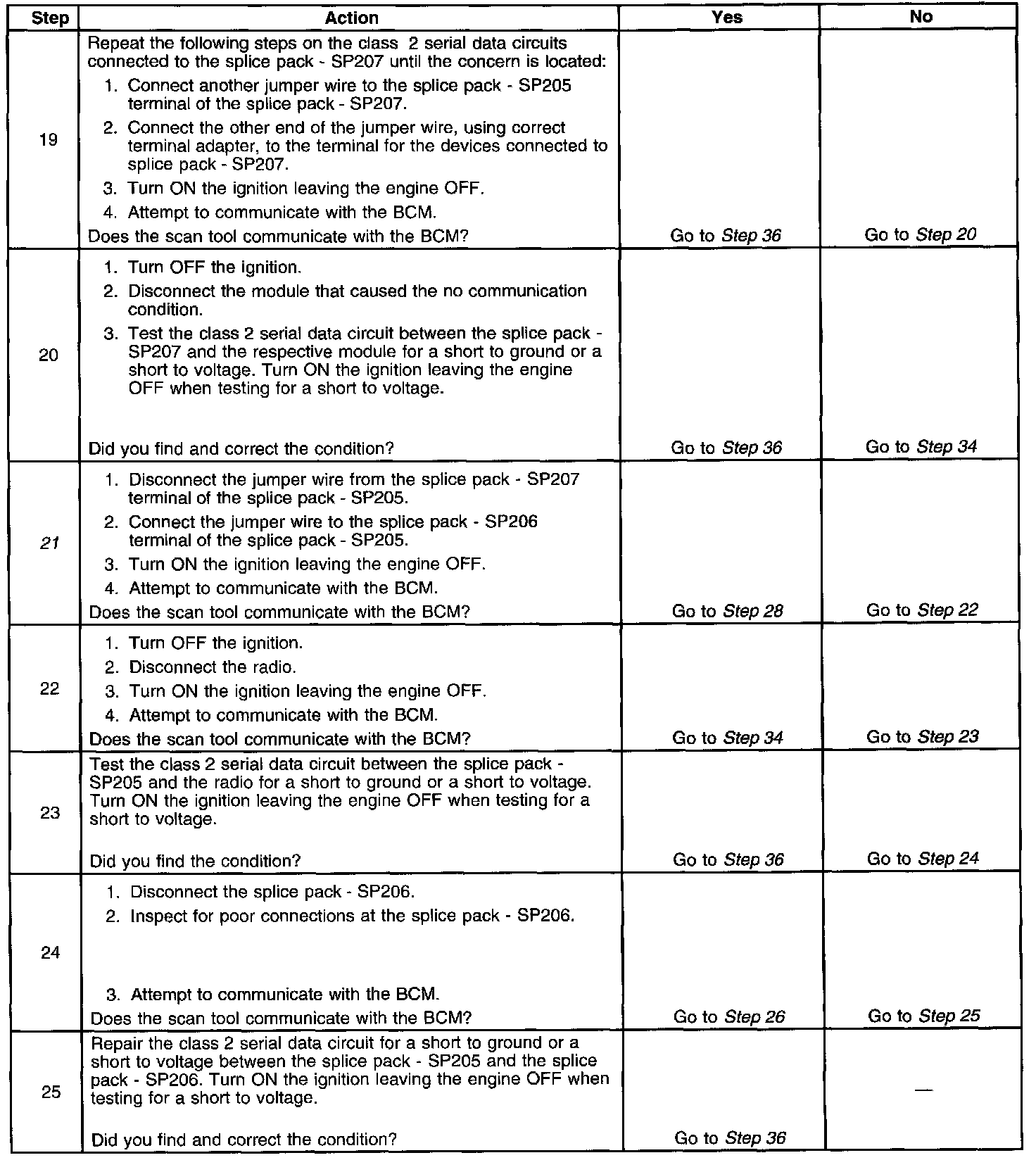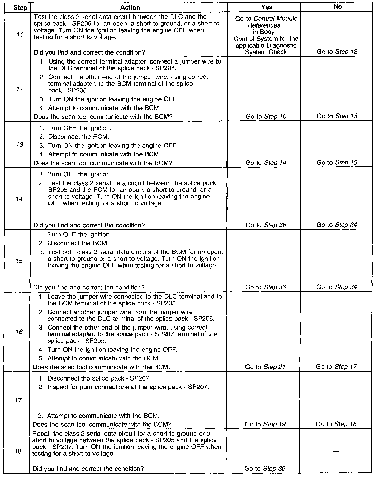 12. The class 2 serial data circuit is shorted to voltage or ground. The condition may be due to the wiring or due to a malfunction in one of the modules. When testing the wire for a short, make sure there is not a module connected to the wire being tested. This test isolates the BCM and the PCM class 2 serial data circuits.