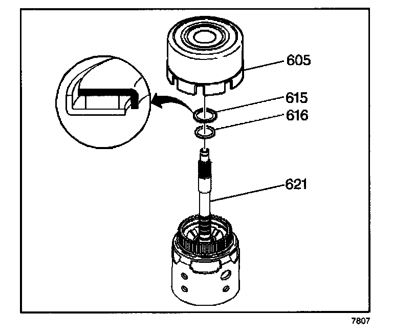 2. Install the stator shaft/selective washer bearing assembly (615) on the input housing (621). The black race on the bearing goes toward the oil pump.