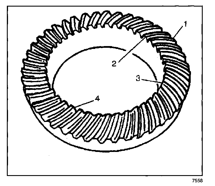The side of the ring gear tooth which curves outward, or is convex, is the drive side (4). The concave side is the coast side (3). The end of the tooth nearest the center of the ring gear is the toe end (2). The end of the tooth farthest away from the center is the heel end (1).
