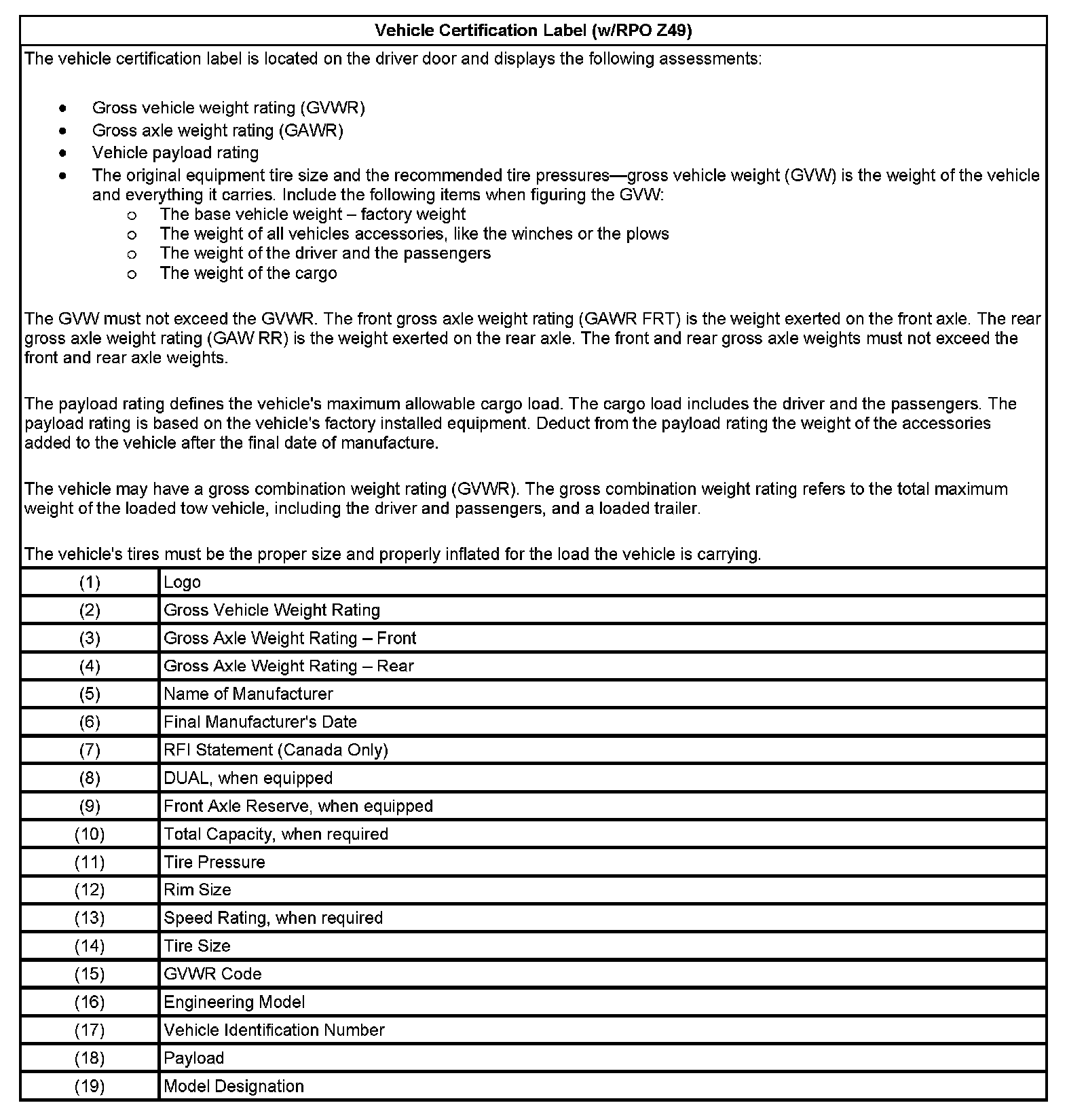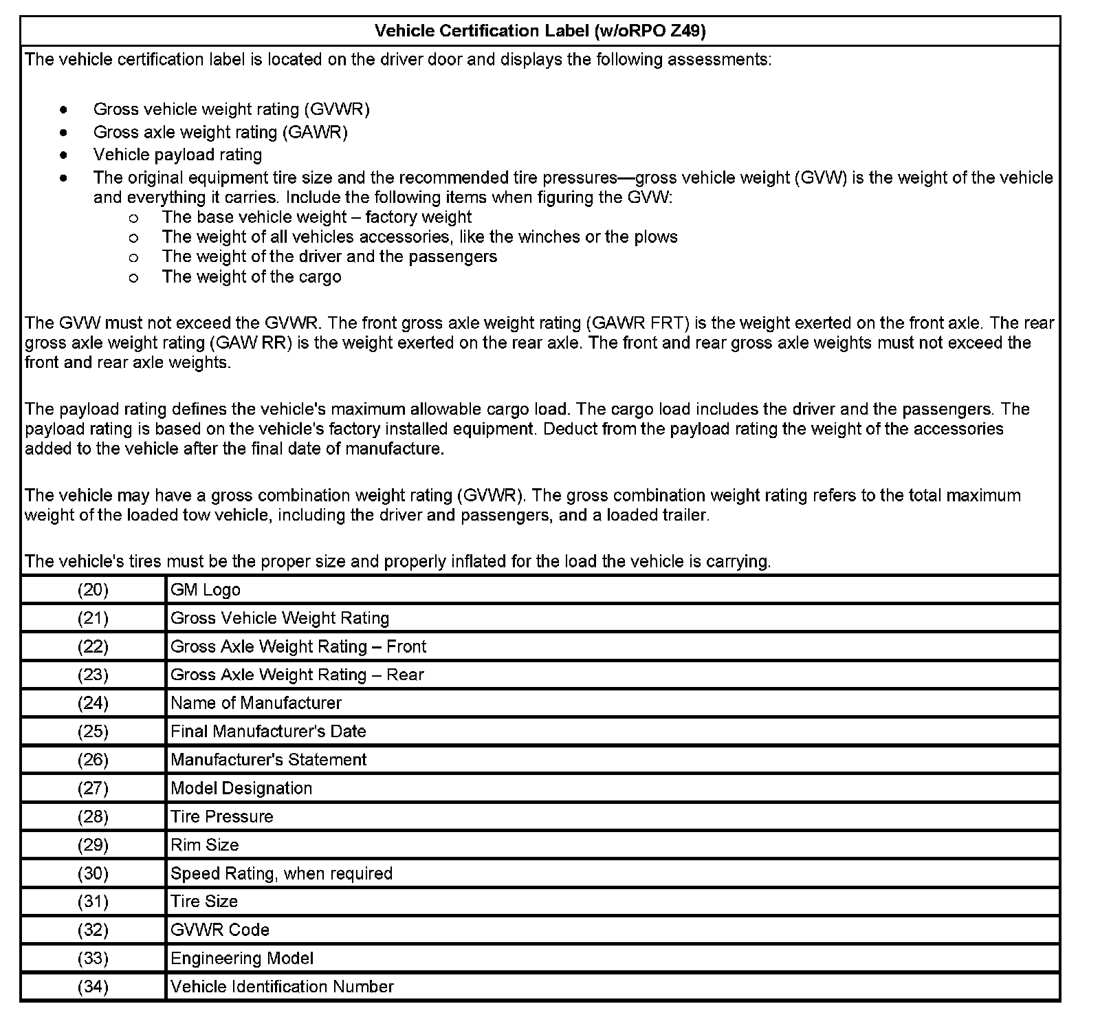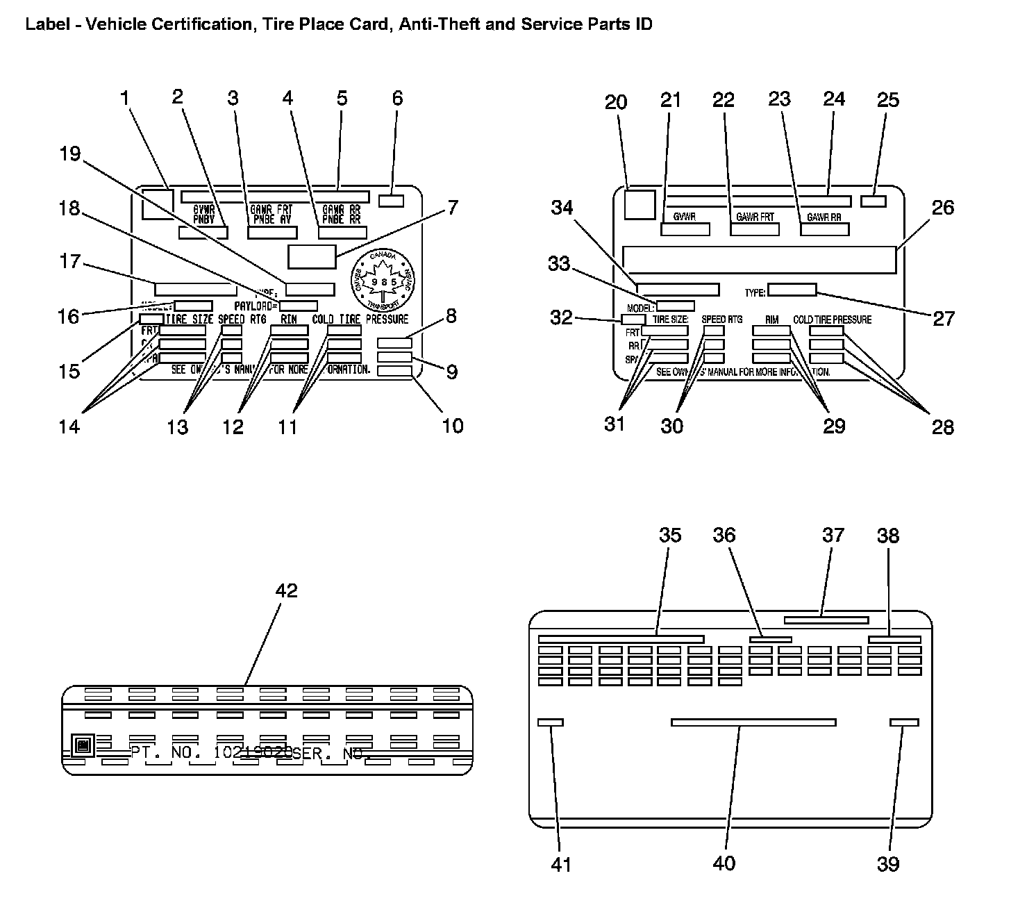 Label - Vehicle Certification, Tire Place Card, Anti-Theft and Service Parts ID: