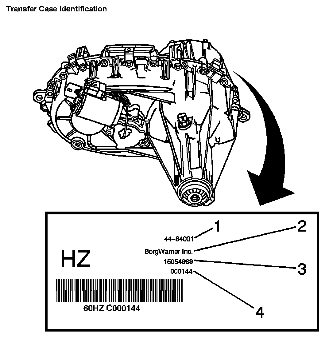 An identification tag is attached to the front half of the transfer case. The tag provides the following information: