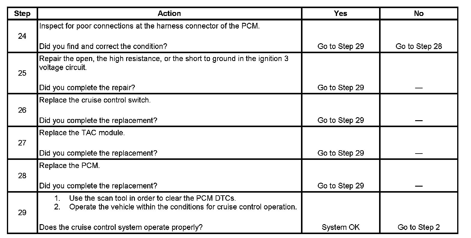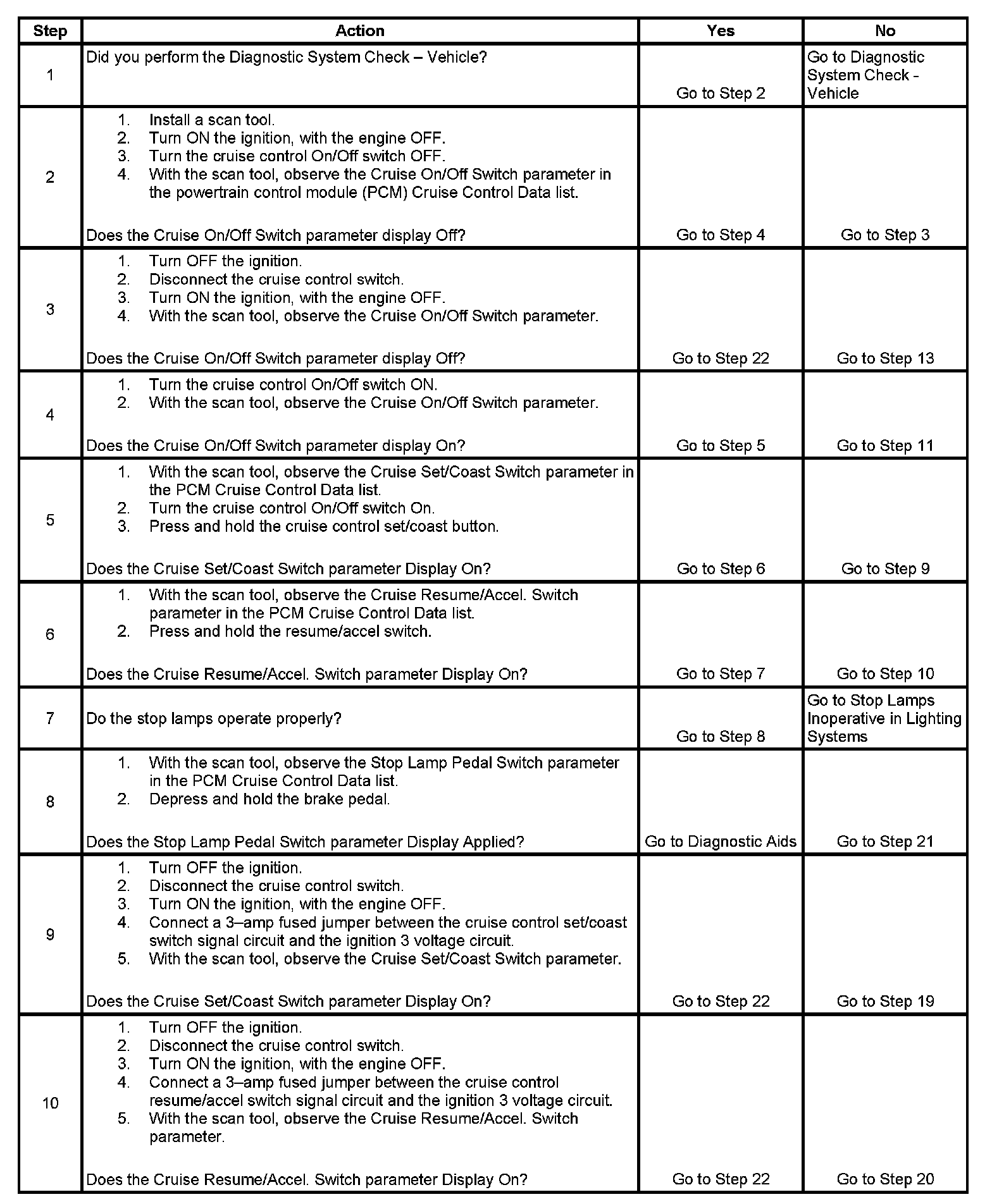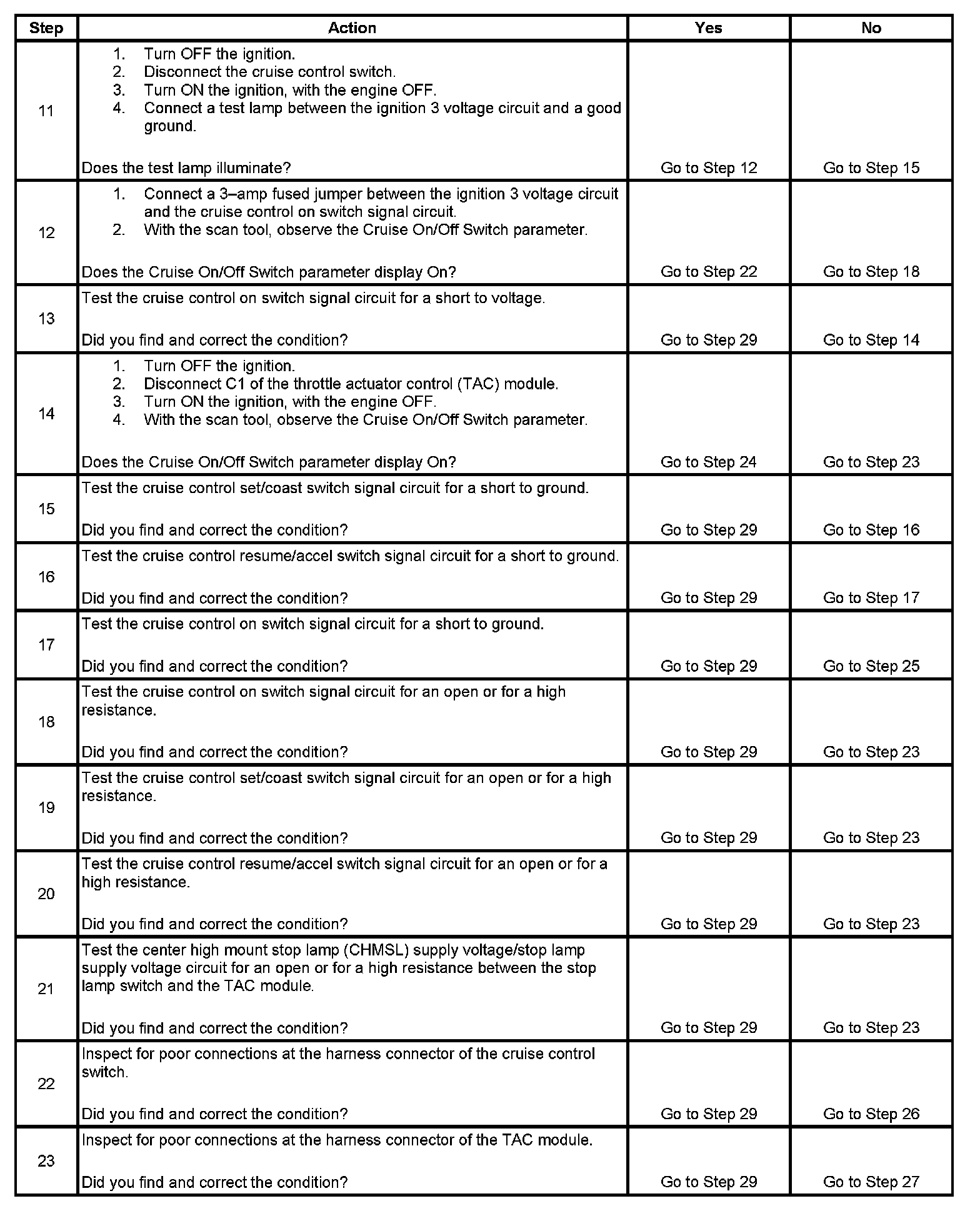 10. This step tests the cruise control resume/accel switch signal circuit for an open or for a high resistance.