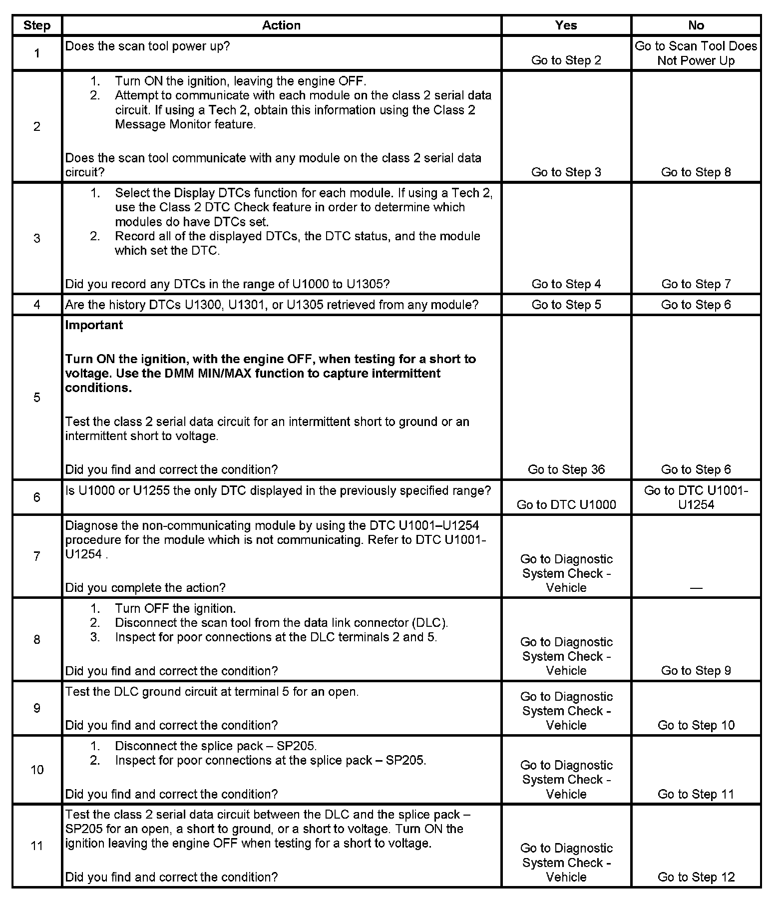 11. An open in the class 2 serial data circuit between the DLC and splice pack - SP205 will prevent the scan tool from communicating with any module. This condition will not set a DTC.