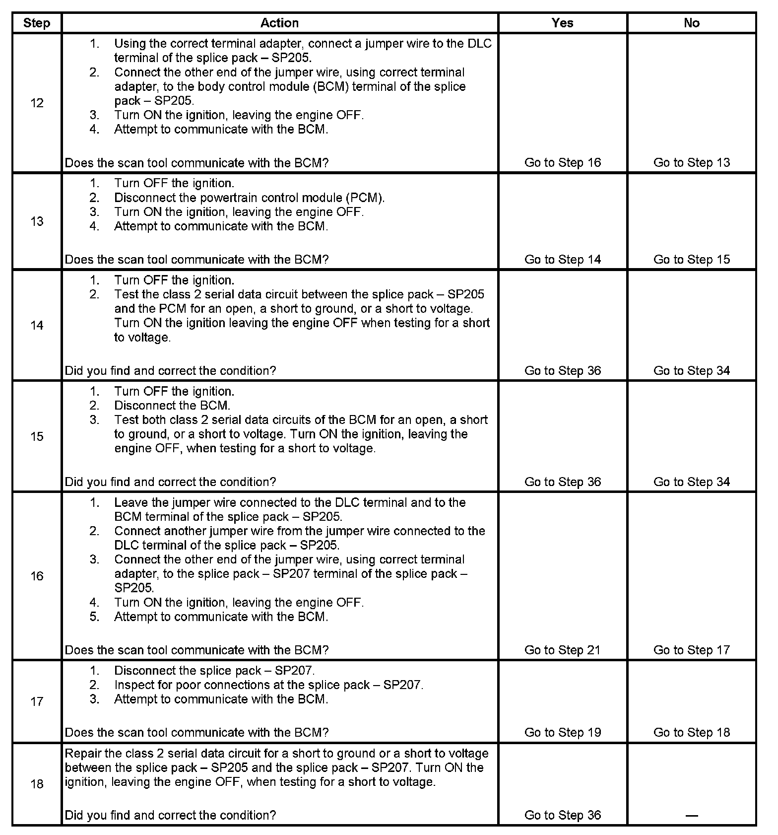 12. The class 2 serial data circuit is shorted to voltage or ground. The condition may be due to the wiring or due to a malfunction in one of the modules. When testing the wire for a short, make sure there is not a module connected to the wire being tested. This test isolates the BCM and the PCM class 2 serial data circuits.