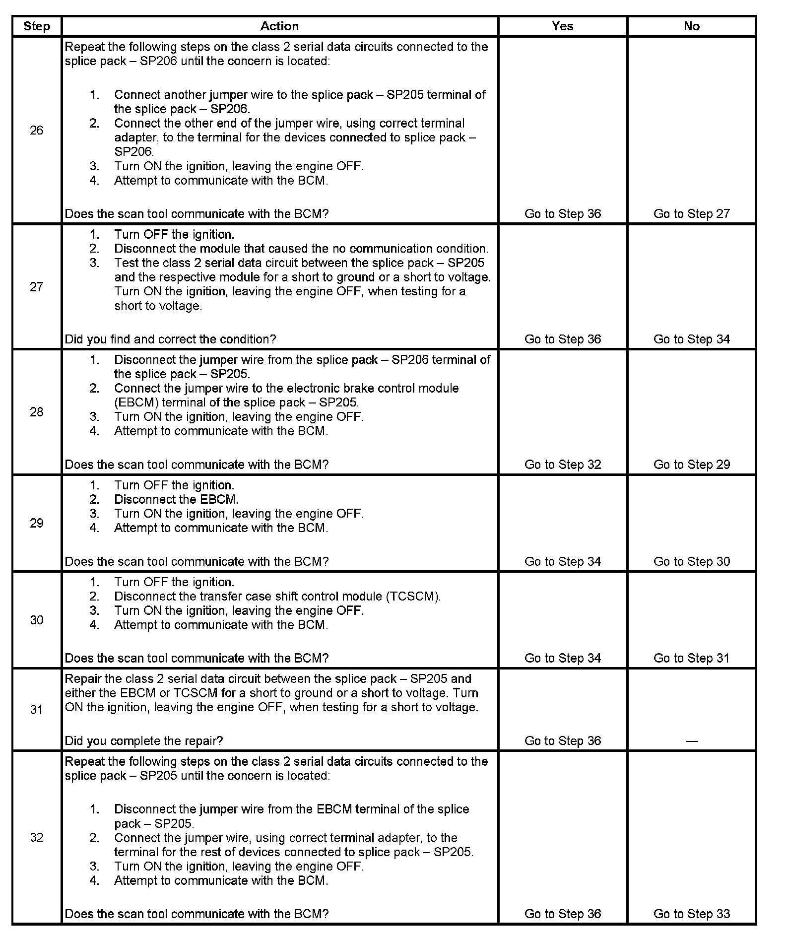 32. This test isolates the rest of the splice pack - SP205 serial data circuits.
