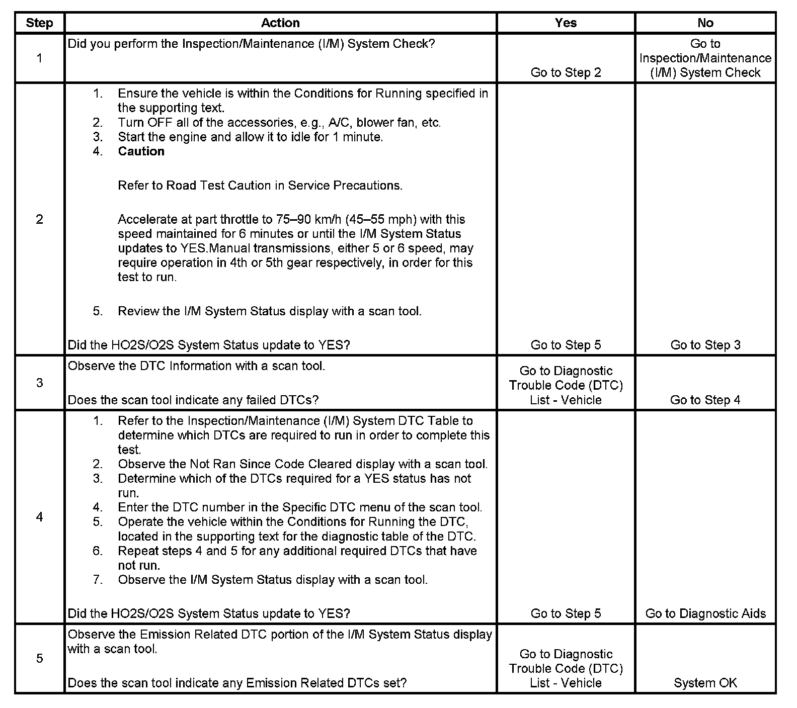 The purpose of this test is to satisfy the enable criteria necessary to execute inspection/maintenance (I/M) readiness diagnostics for the oxygen sensor (O2S, HO2S) system. The test may be used to set the I/M System Status to YES. The I/M System Status display on the scan tool provides an indication of whether the control module has completed the required tests. The I/M System Status does not indicate that the tests have passed or failed. When all of the diagnostics for a specific system have run and passed, the I/M System Status will update to YES. If a test for a specific system has failed, the I/M System Status will update to YES, indicating a determination was made, even if all of the other tests for that system have not run.