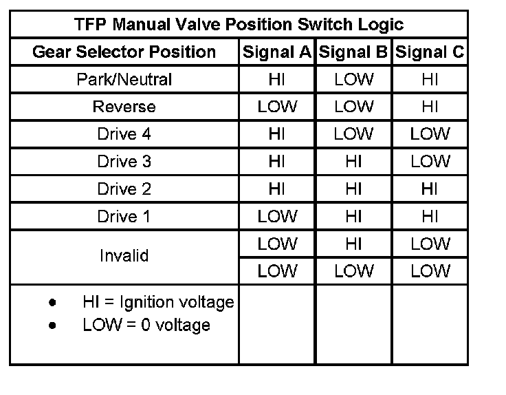 Transmission Fluid Pressure (TFP) Manual Valve Position Switch Logic: