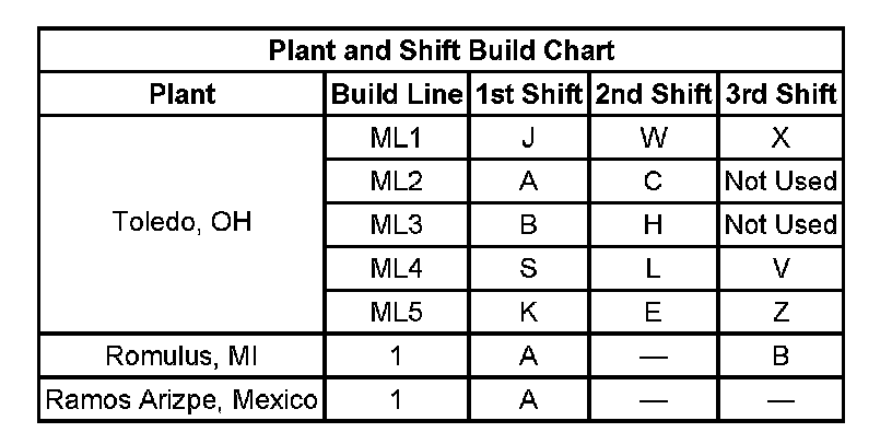 5 - Shift Built (A, B, J = First Shift; C, H, W = Second Shift)