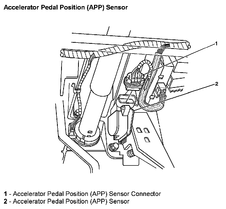The APP sensor is mounted on the accelerator pedal control assembly. The sensor is made up of 2 individual sensors within one housing. Two separate signal, low reference, and 5-volt reference circuits are used in order to interface the accelerator pedal sensor assembly with the engine control module (ECM). Each sensor has a unique functionality to determine pedal position. The ECM uses the APP sensor to determine the amount of acceleration or deceleration desired by the person driving the vehicle. The APP sensor 1 voltage should increase as the accelerator pedal is depressed, from below 1.0 volt at 0 pedal travel to above 4 volts at 100 percent pedal travel. APP sensor 2 voltage should increase from above 0.43 volts at 0 pedal travel to above 2.0 volts at 100 percent pedal travel.