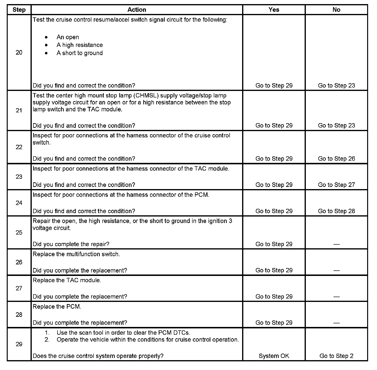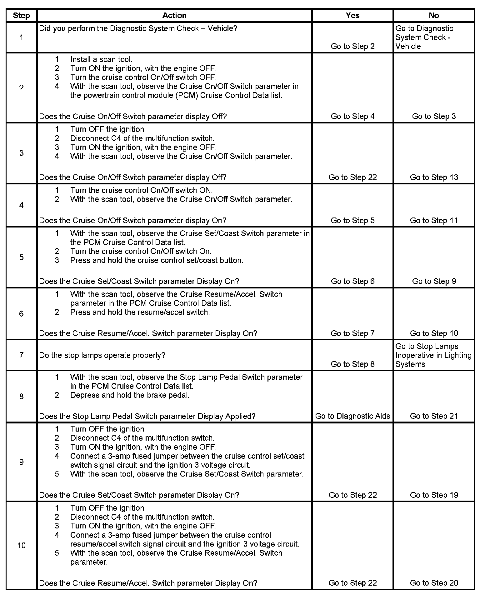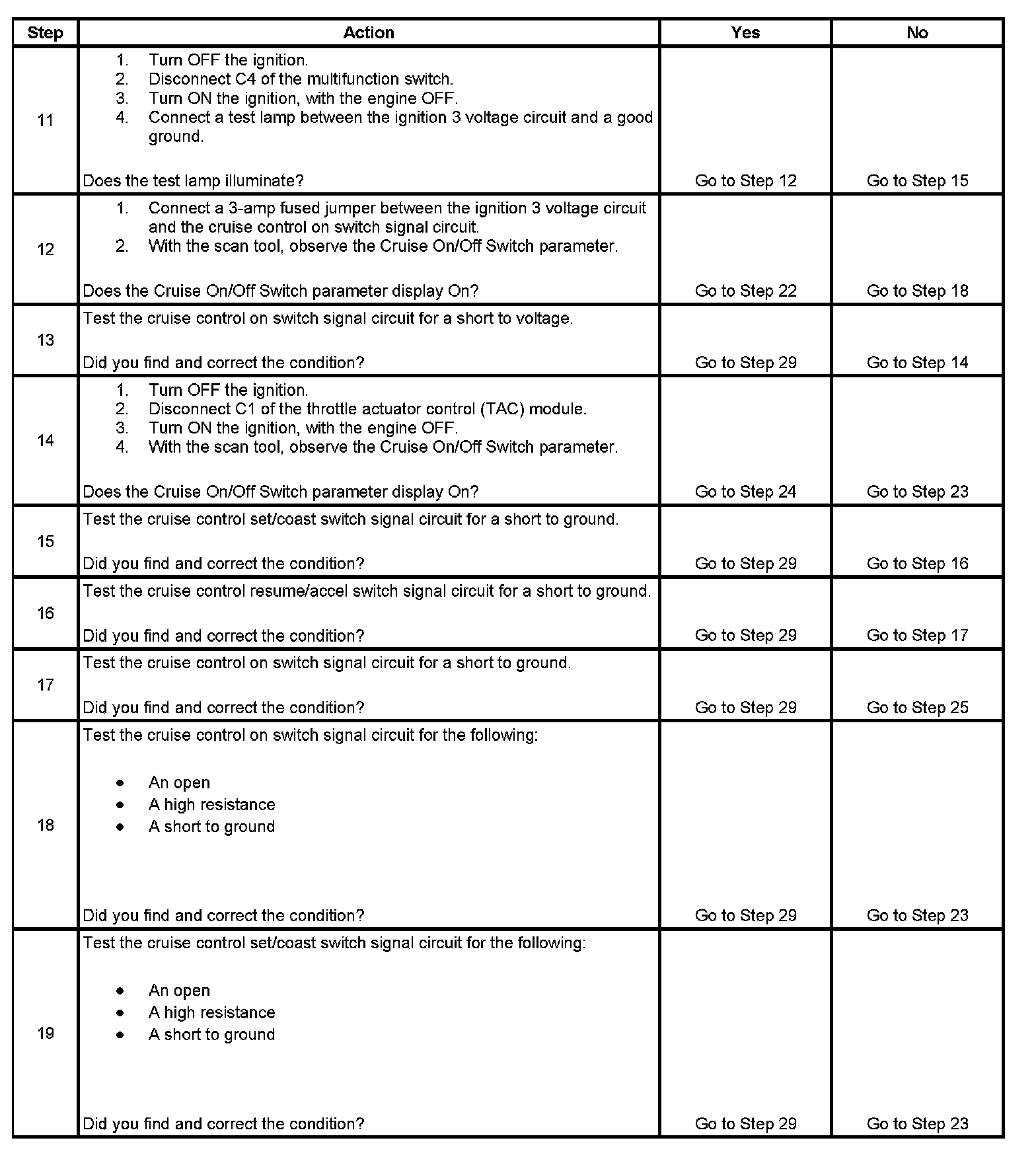 10. This step tests the cruise control resume/accel switch signal circuit for an open or for a high resistance.