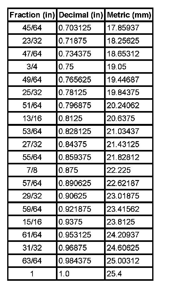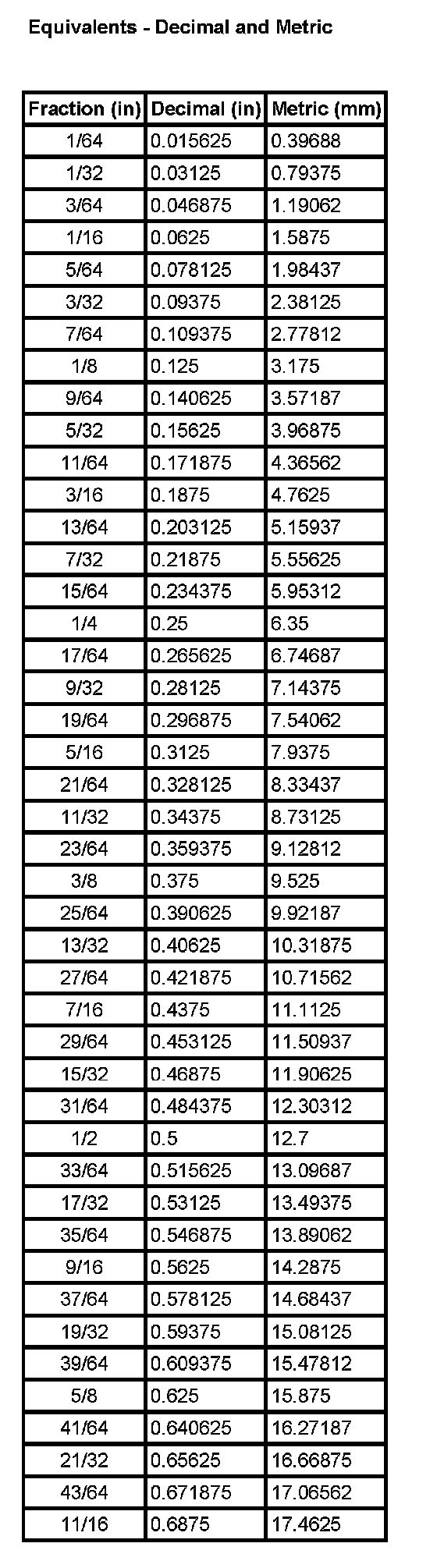 Equivalents - Decimal and Metric