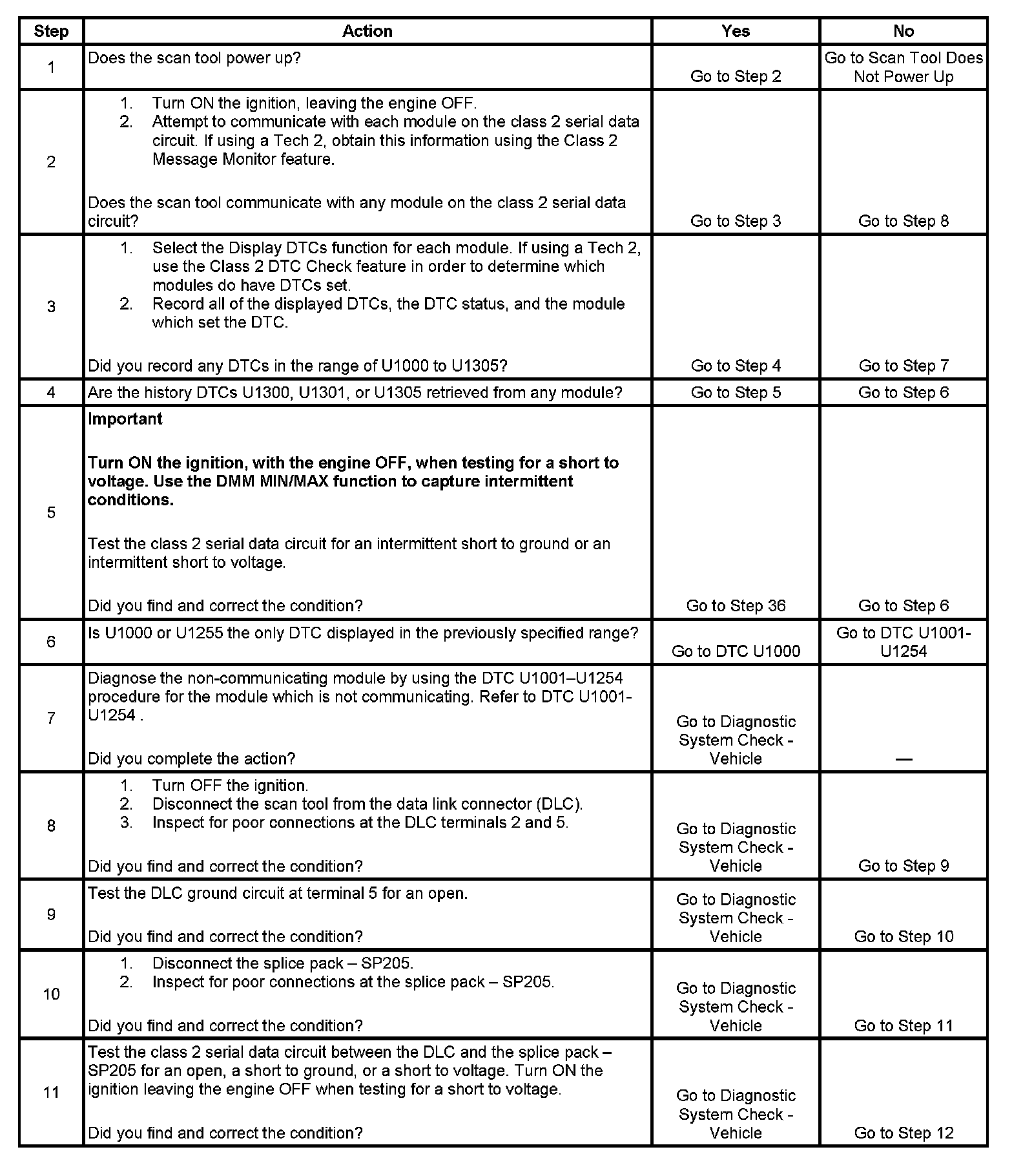 11. An open in the class 2 serial data circuit between the DLC and splice pack - SP205 will prevent the scan tool from communicating with any module. This condition will not set a DTC.