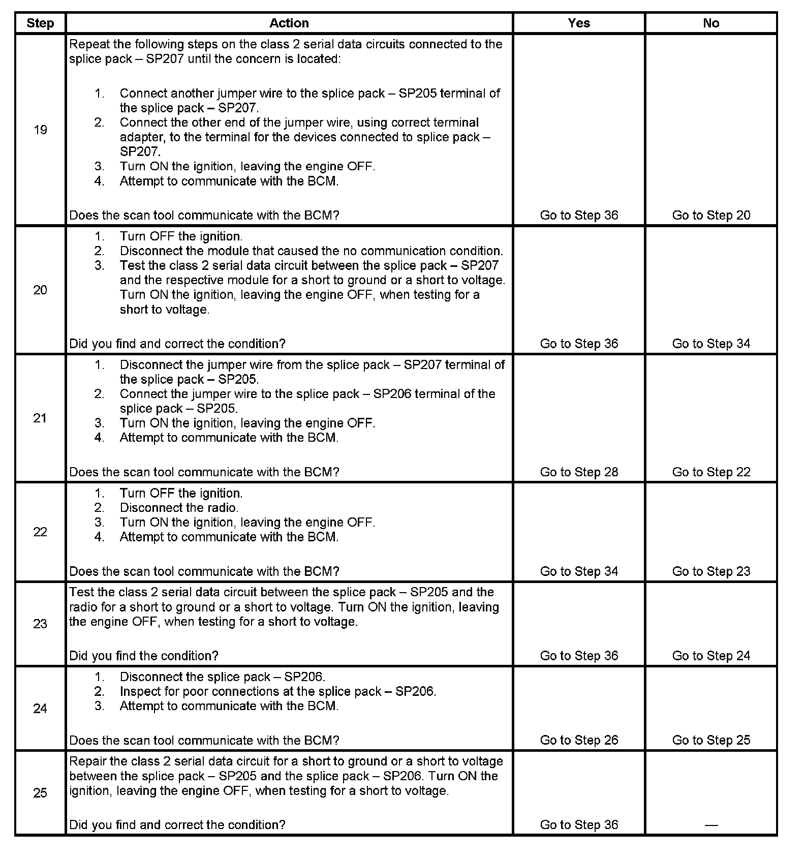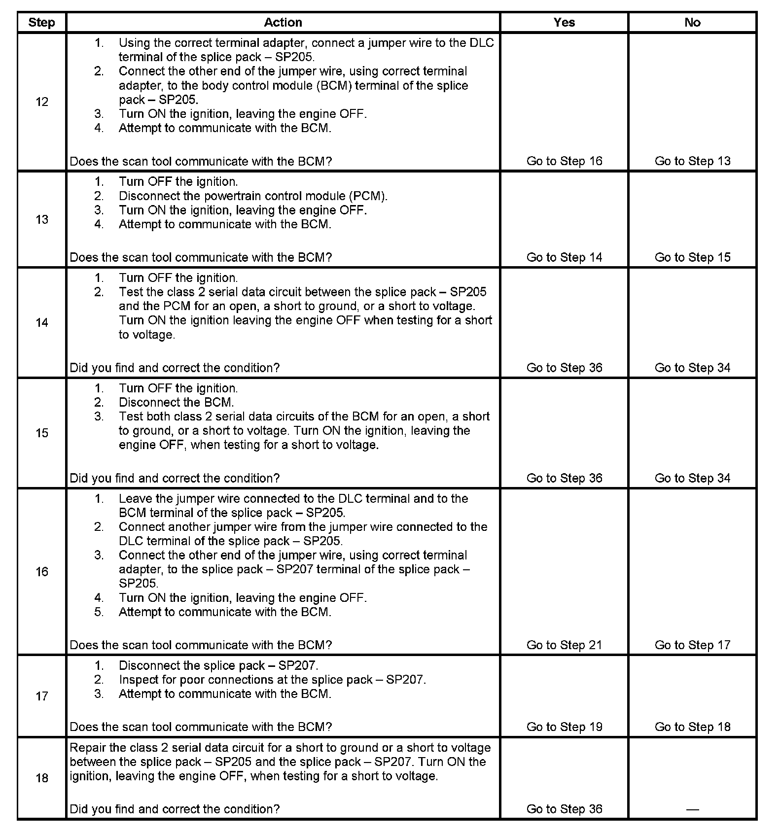 12. The class 2 serial data circuit is shorted to voltage or ground. The condition may be due to the wiring or due to a malfunction in one of the modules. When testing the wire for a short, make sure there is not a module connected to the wire being tested. This test isolates the BCM and the PCM class 2 serial data circuits.