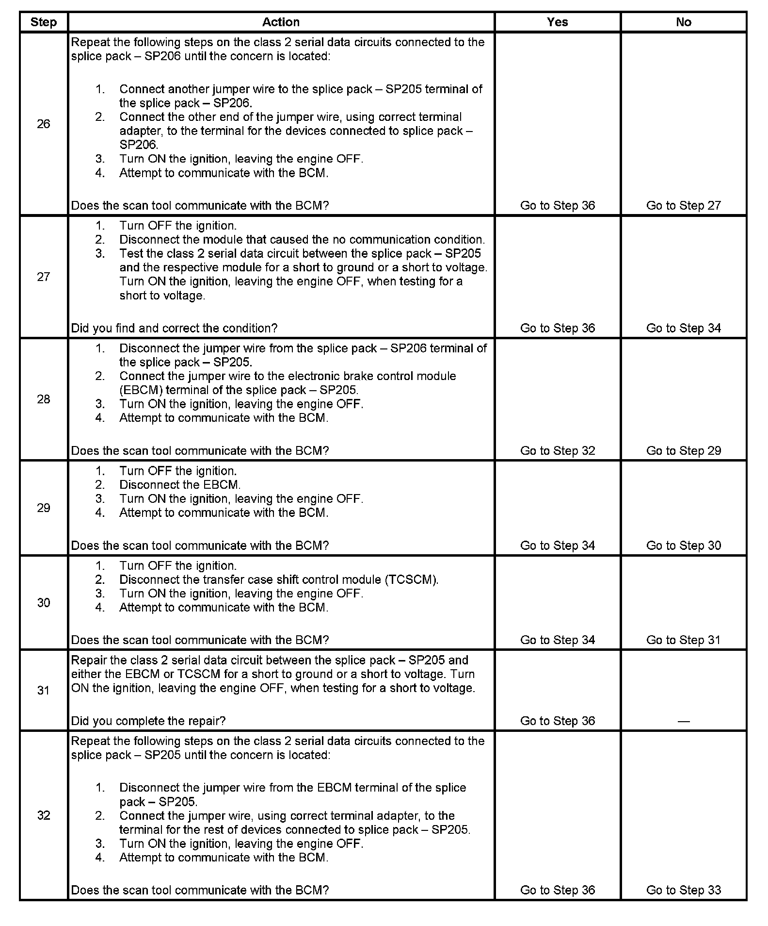 32. This test isolates the rest of the splice pack - SP205 serial data circuits.