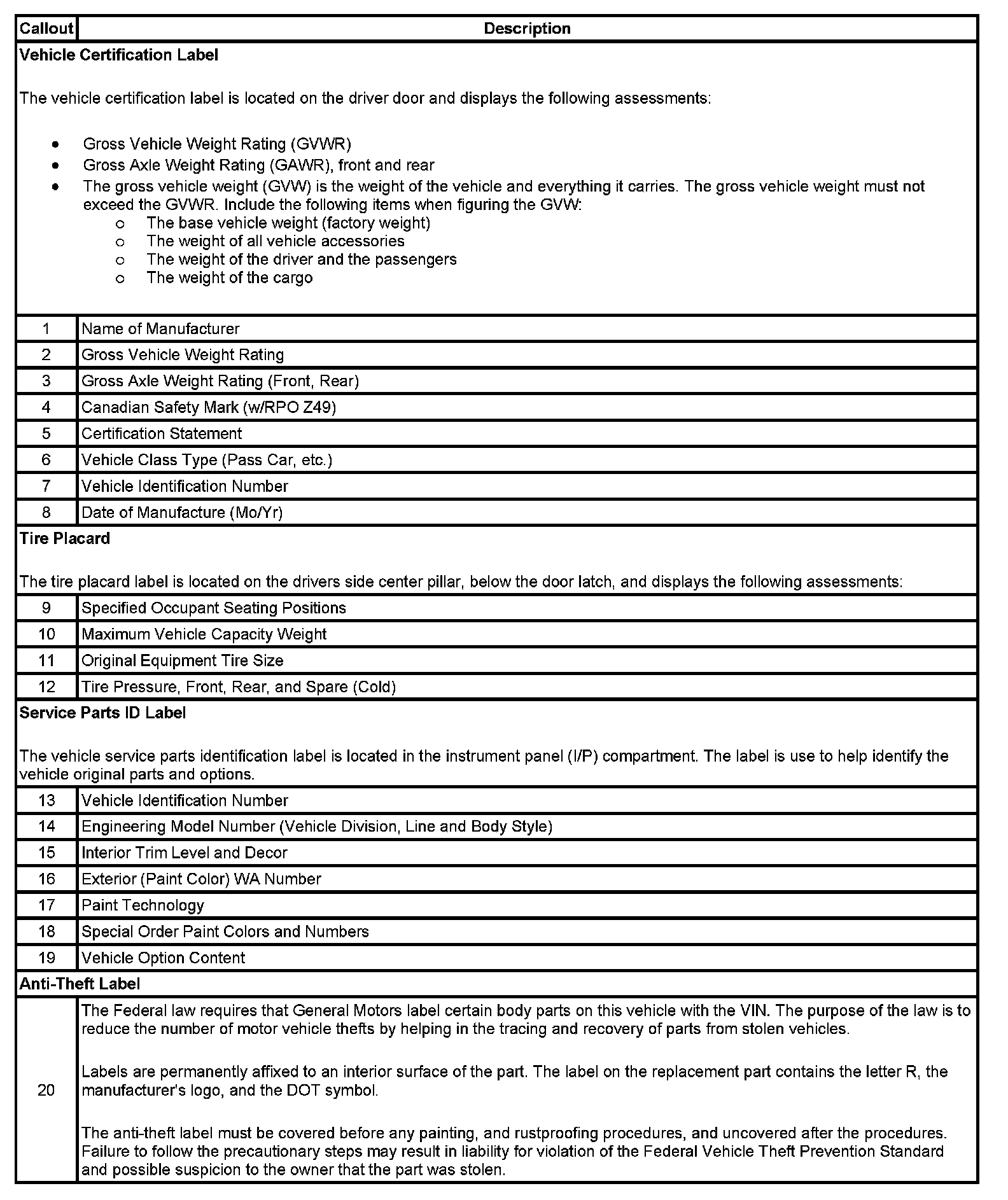 Label - Vehicle Certification, Tire Place Card, Anti-Theft And Service Parts ID: