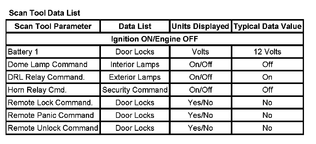 The Keyless Entry Scan Tool Data List contains all of the keyless entry related parameters that are available on the scan tool. The parameters in the list are arranged in alphabetical order. The column, "Data List," indicates the location of the parameter within the scan tool menu selections. Use the Keyless Entry Scan Tool Data List as directed by a diagnostic table or in order to supplement the diagnostic procedures. Begin all of the diagnostic procedures with Diagnostic System Check - Vehicle. Diagnostic System Check - Vehicle