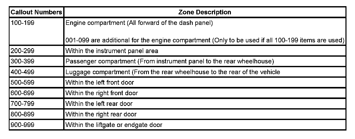 All grounds, in-line connectors, pass-through grommets, and splices have identifying numbers that correspond to where they are located in the vehicle. The following table explains the numbering system.