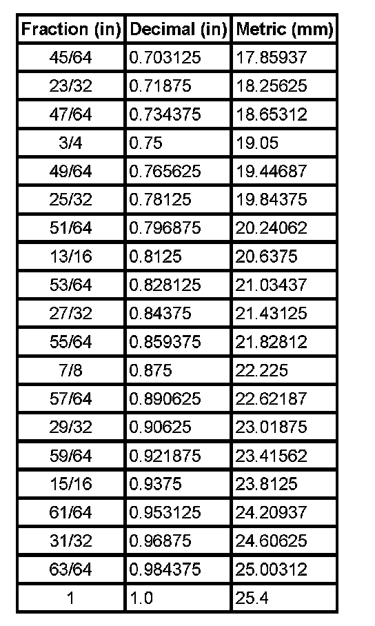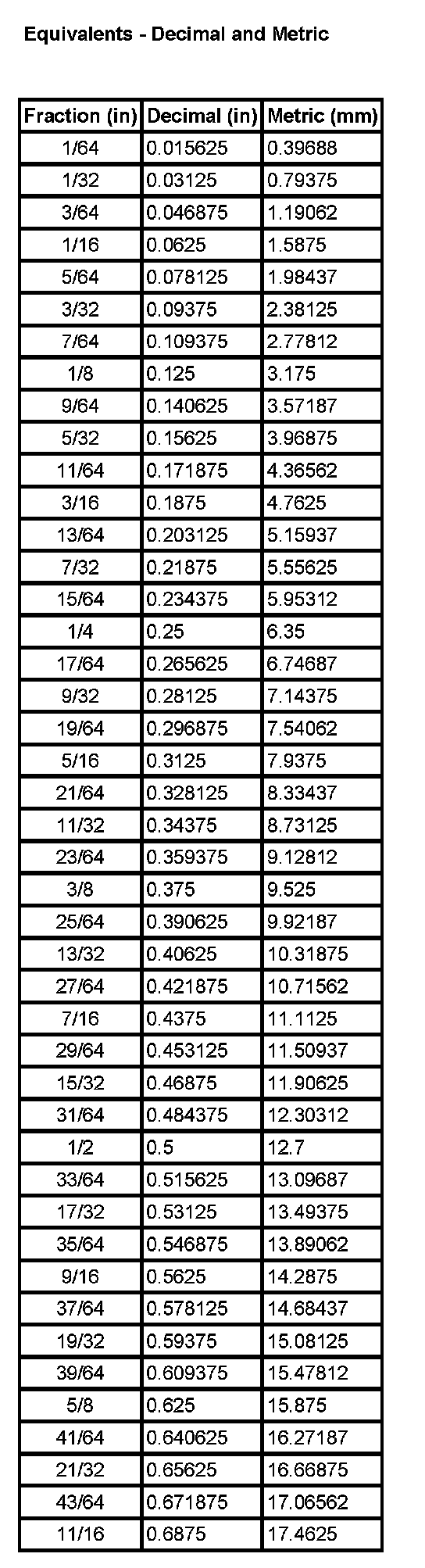 Equivalents - Decimal and Metric