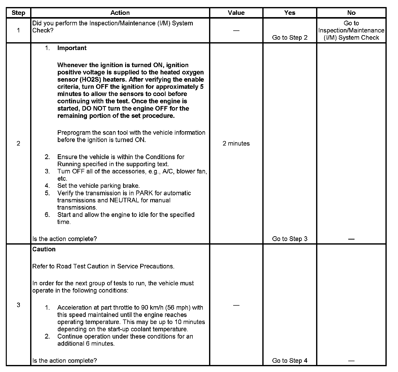 3. This step is to run the EVAP, AIR and the Oxygen Sensor Tests. The EVAP Test begins once the engine coolant reaches a calibrated temperature. The AIR Test, if equipped, begins shortly after Closed Loop and the indicated speed is achieved. The Oxygen Sensor Tests begin once the engine is at operating temperature, in Closed Loop fuel control, and a calibrated amount of time has elapsed.