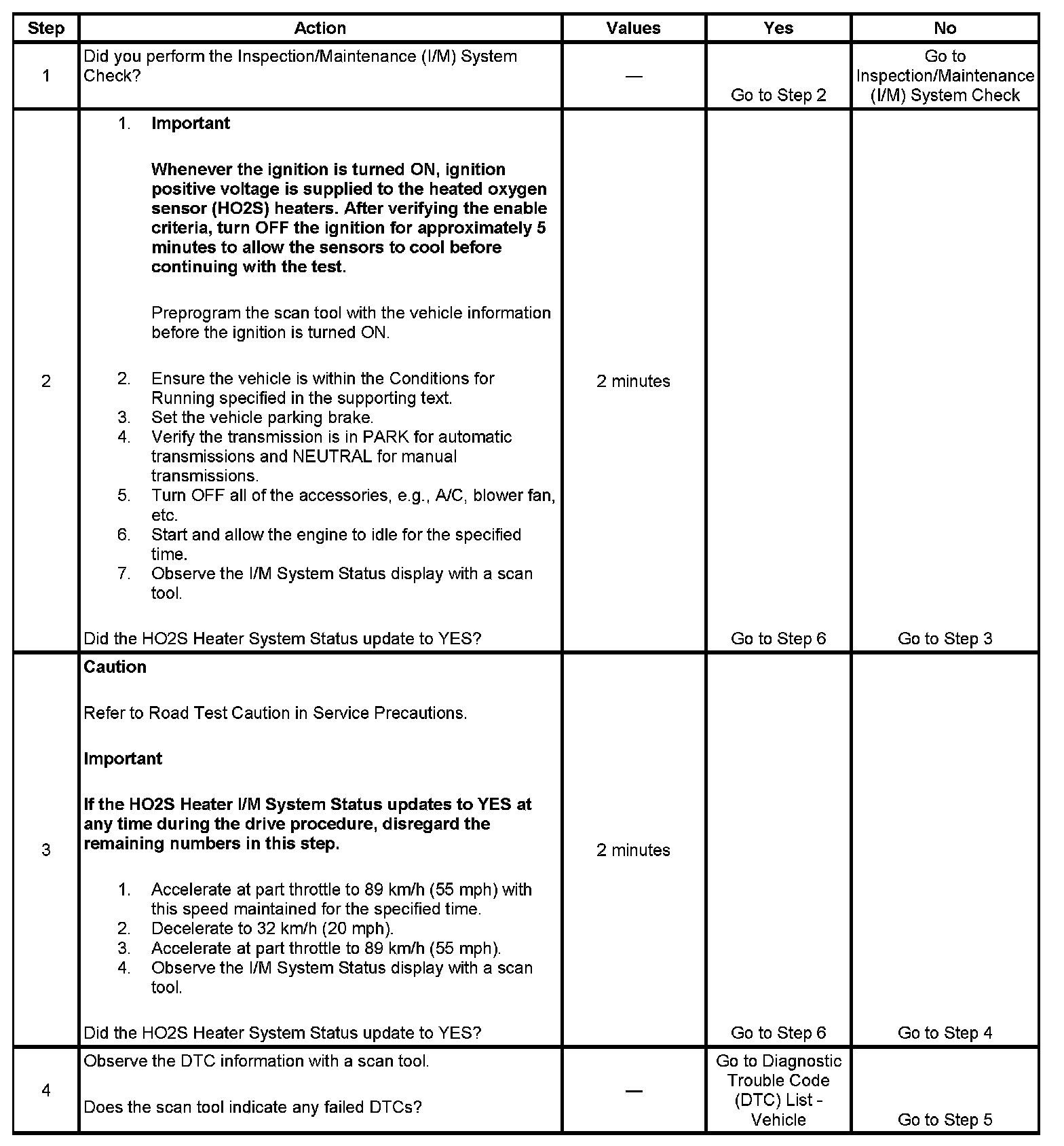 The purpose of this procedure is to satisfy the enable criteria necessary to execute inspection/maintenance (I/M) readiness diagnostics for the heated oxygen sensor (HO2S) heater system. This procedure may be used to set the HO2S Heater I/M System Status display on the scan tool to YES. The HO2S Heater I/M System Status display indicates whether or not the control module has completed the readiness diagnostics. The readiness diagnostics complete when all DTCs comprising the diagnostics run and pass, or any DTC comprising the diagnostics illuminates the malfunction indicator lamp (MIL). Once the diagnostics complete, the HO2S Heater I/M System Status display will be updated to YES.