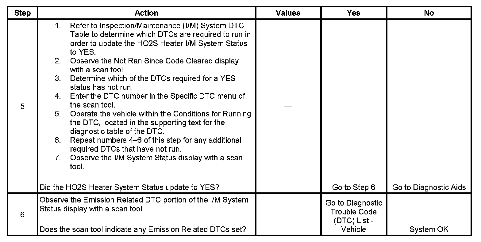 If there is an impending failure, the system may require more time to run the diagnostic than was allotted in the system set procedure. If DTCs do not run and no DTC is set, review the appropriated scan tool data list and service information. This will give an indication of why the DTCs do not run. Some diagnostics may abort due to changes in the conditions while the diagnostics are running. For example, changes in engine load such as a cooling fan or A/C compressor clutch turning ON, may cause the diagnostics to abort. If the HO2S Heater I/M System Status does not update to YES, the procedure can be repeated until a YES status is achieved.