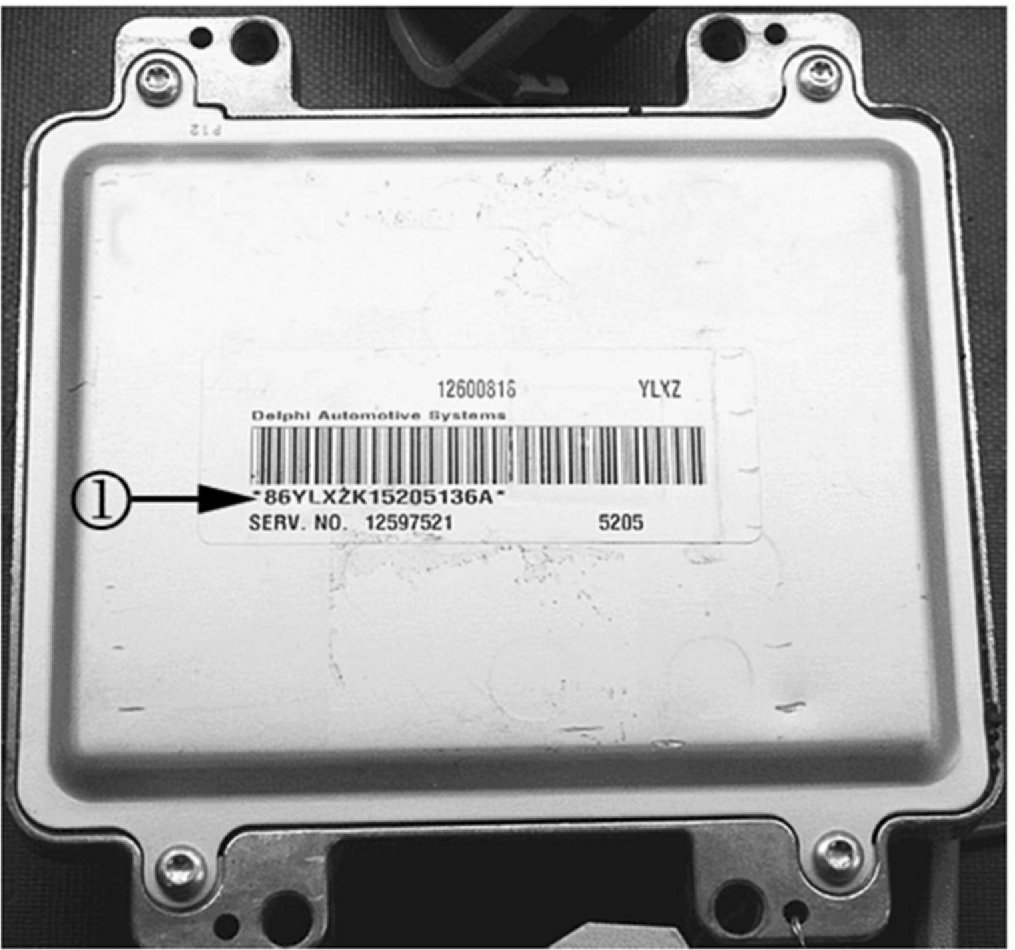 Before following the diagnostic information in SI on DTCs P1516, P2135 and/or P2138, an inspection of the PCM serial number year and Julian (PCM build) date will be necessary to determine if the PCM will need to be replaced to correct the repeat DTC P1516. Refer to Engine Control Module Replacement in SI in order to remove the PCM. Refer to the above graphic illustration (1) for the location of the PCM serial number.