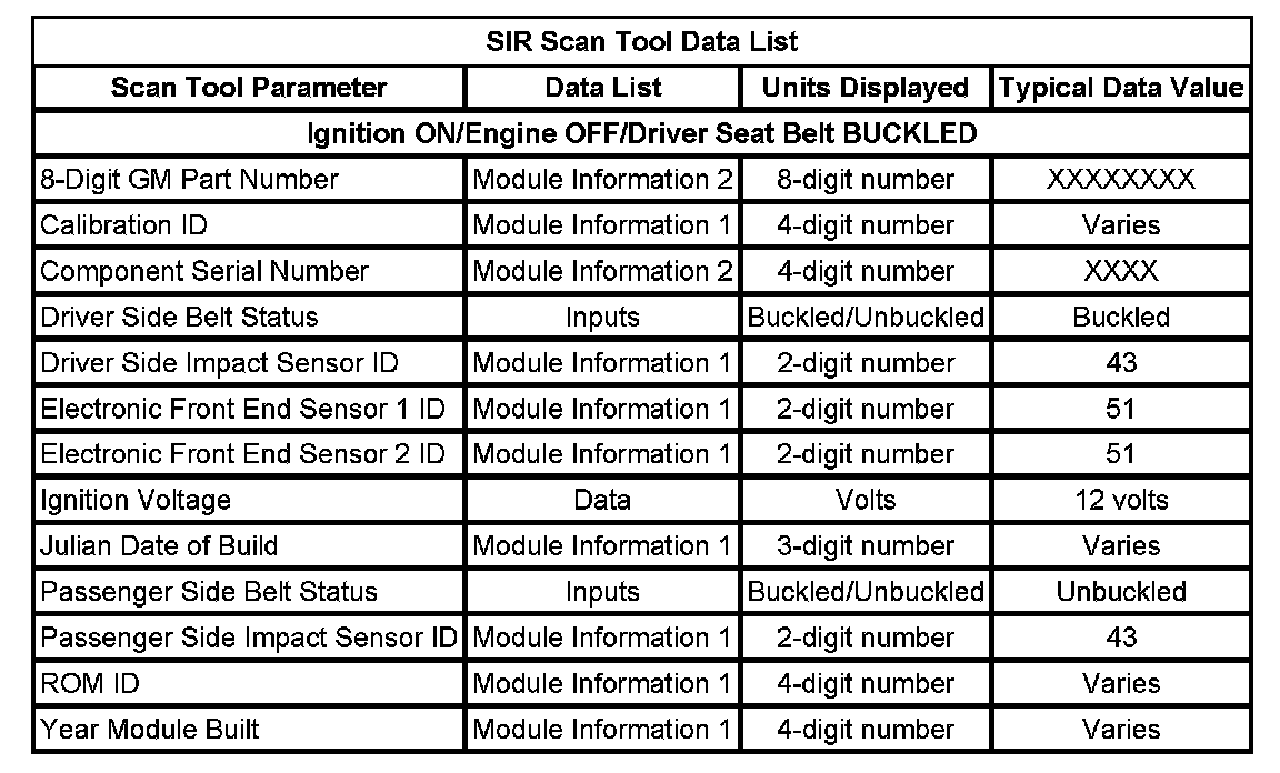 The SIR Scan Tool Data List contains all the restraint system related parameters that are available on the scan tool. The parameters in the list are arranged in alphabetical order. The column, "Data List," indicates the location of the parameter within the scan tool menu selections.