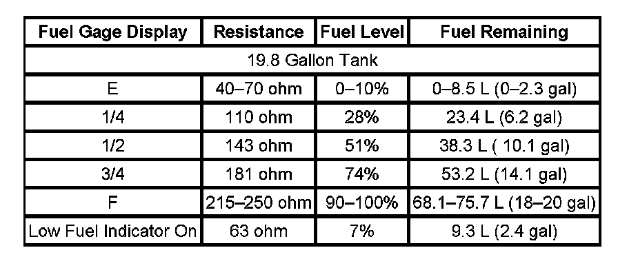 The information in this table is intended for use with the J 33431-C Signal Generator and Instrument Panel Tester. The fuel level sensor values represent the test values to be used on the Signal Generator to drive the fuel gage display to the indicated positions. Vehicles that require more than one fuel level sensor calculate gage position from many possible resistance combinations of fuel levels between the two tanks. Therefore, the values in the table may not correlate directly to readings taken from the vehicle primary or secondary sending units.