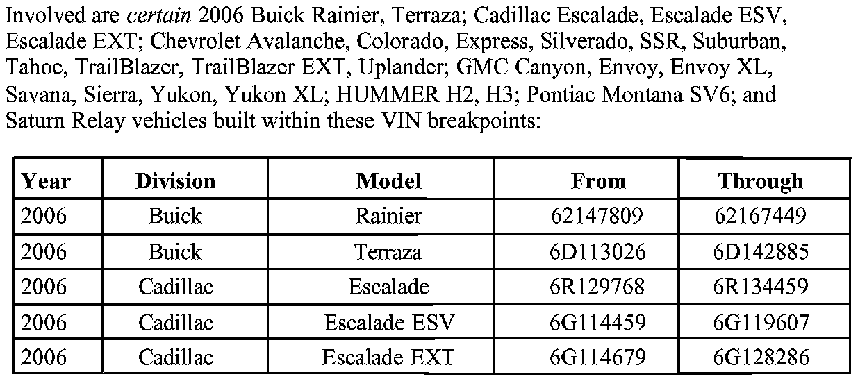 General Motors has decided that certain 2006 Buick Rainier, Terraza; Cadillac Escalade, Escalade ESV, Escalade EXT; Chevrolet Avalanche, Colorado, Express, Silverado, SSR, Suburban, Tahoe, TrailBazer, TrailBlazer EXT, Uplander; GMC Canyon, Envoy, Envoy XL, Savana, Sierra, Yukon, Yukon XL; HUMMER H2, H3; Pontiac Montana SV6; and Saturn Relay vehicles fail to conform to Federal Motor Vehicle Safety Standard 110, Tire Selection and Rims. These vehicles have an incorrect value for the maximum combined weight of occupants and cargo printed on the Tire and Loading Information Label. Loading the vehicle to the amount shown could exceed its gross vehicle weight rating (GVWR). Continuous overloading could reduce the long-term durability of chassis components.