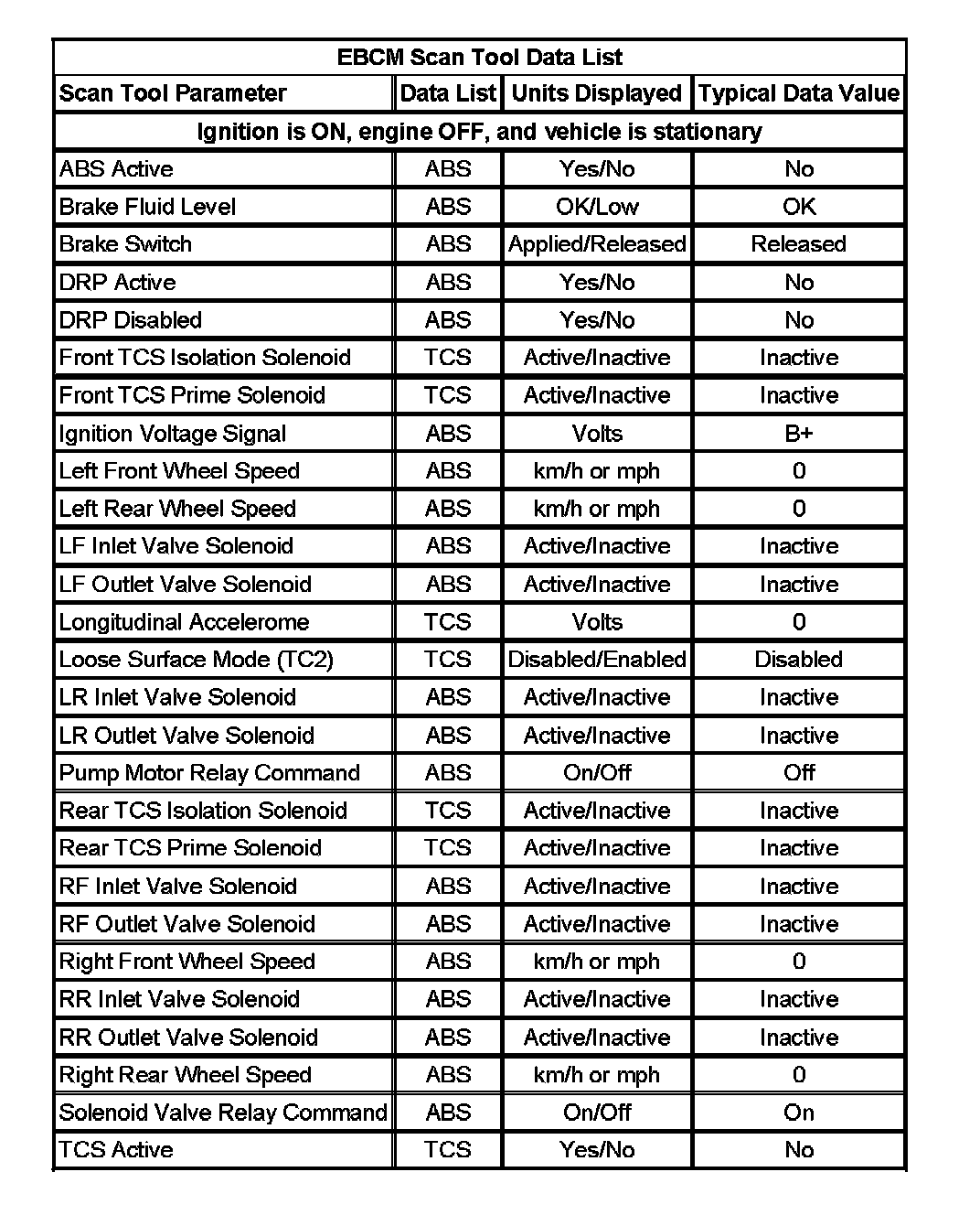 EBCM Scan Tool Data List: