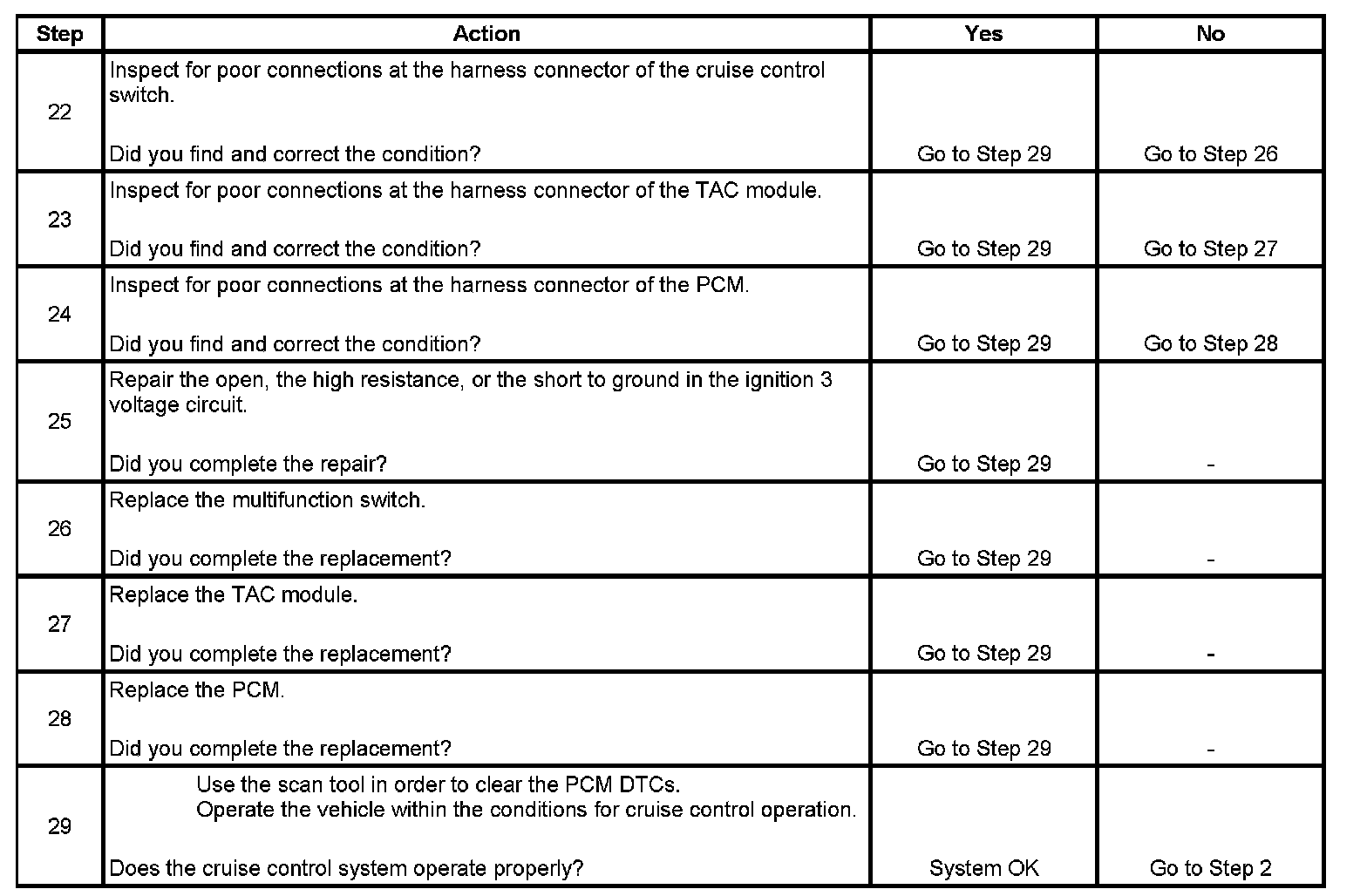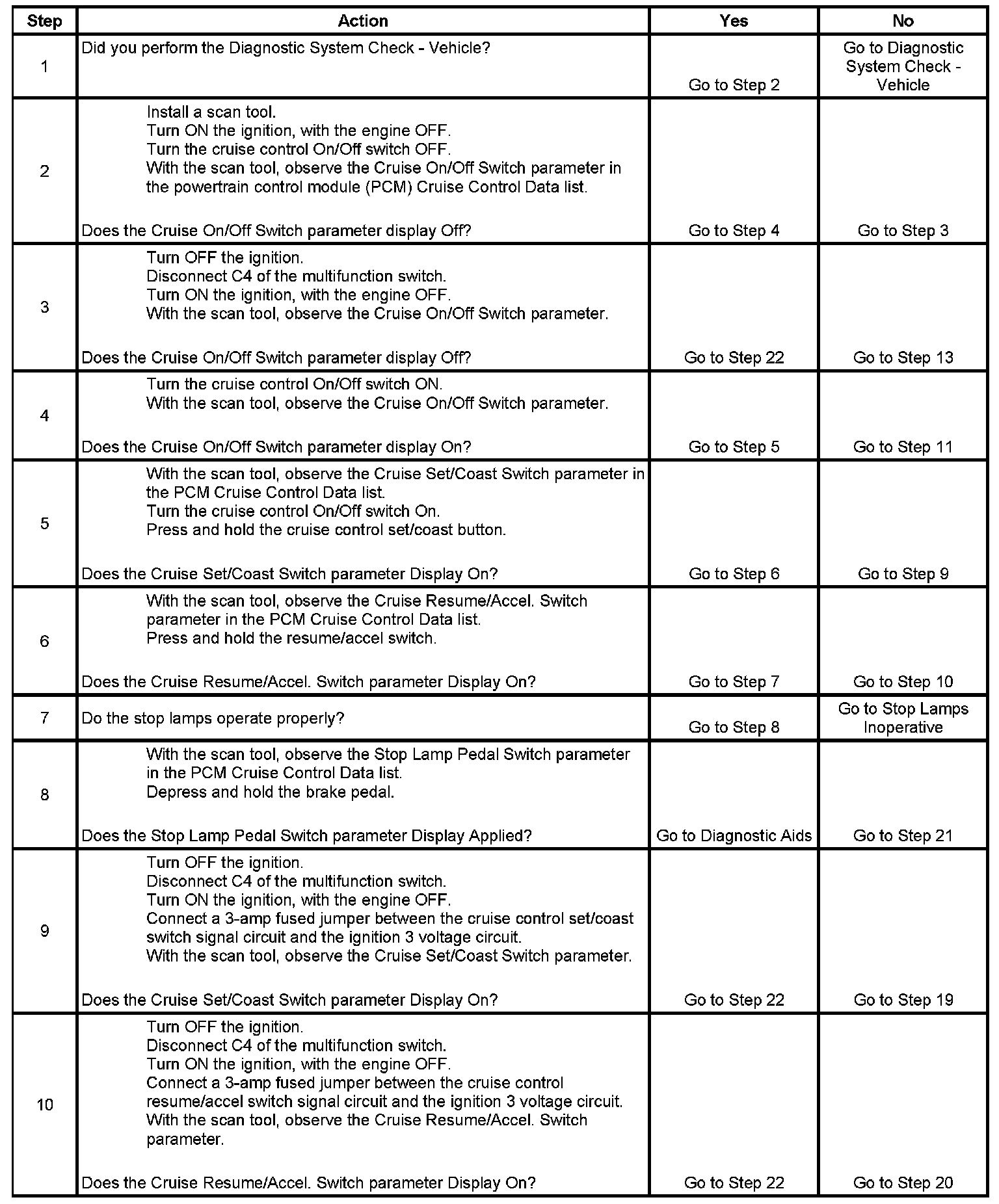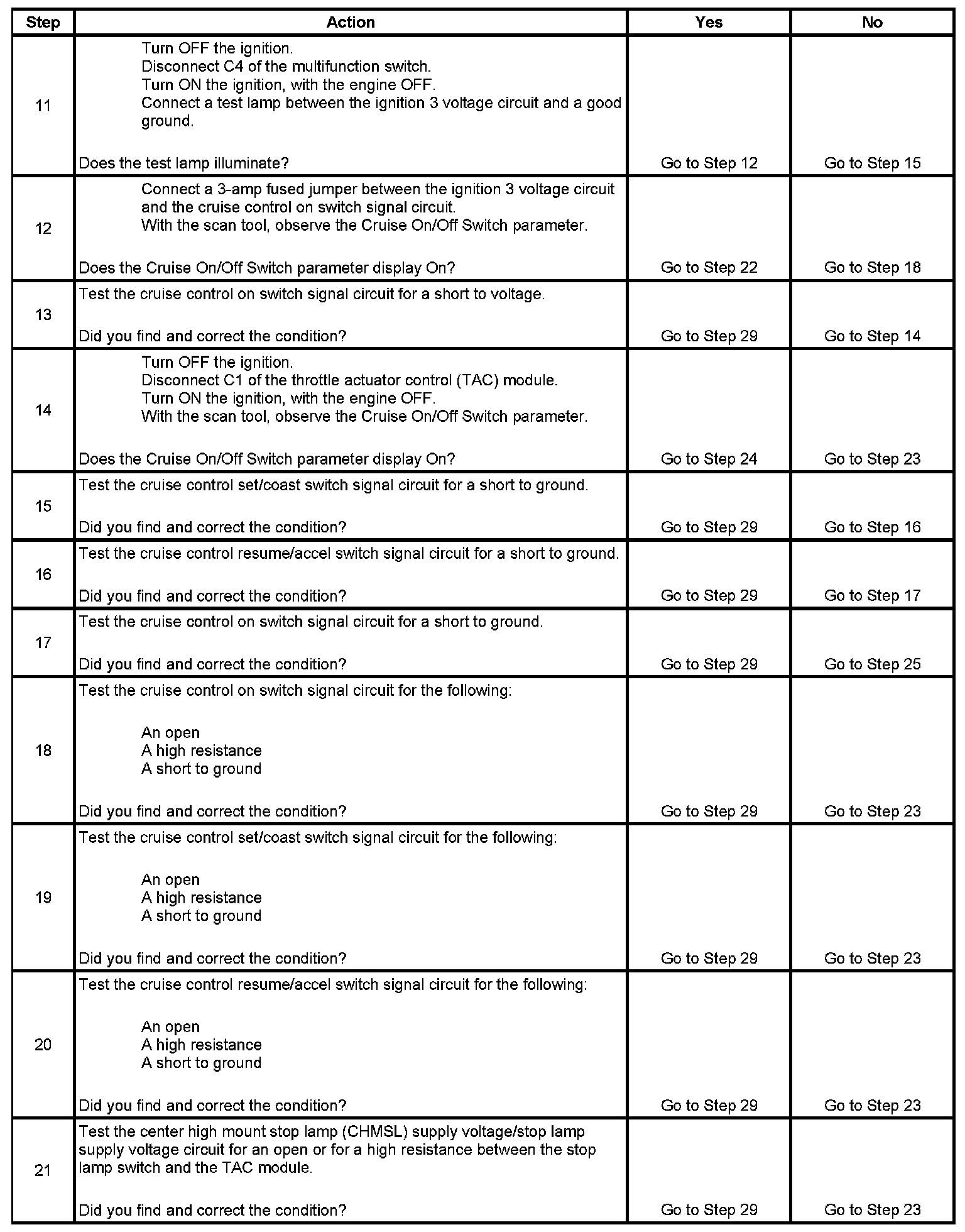 10. This step tests the cruise control resume/accel switch signal circuit for an open or for a high resistance.