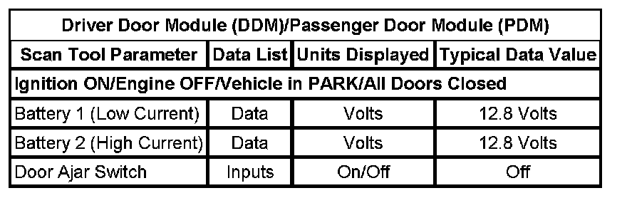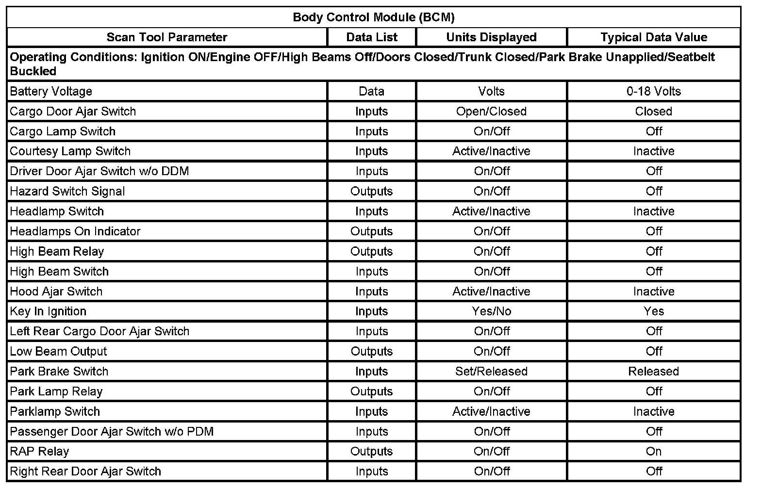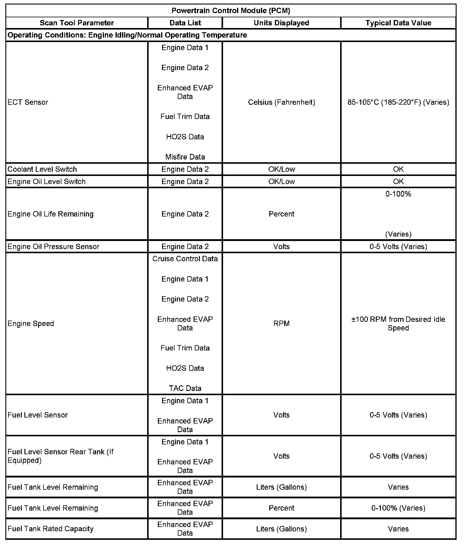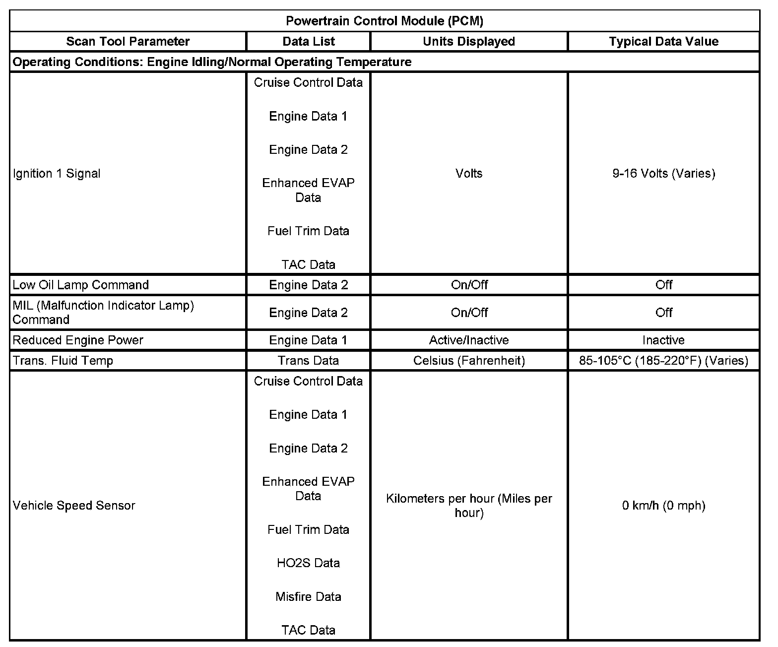 The typical data values are obtained from a properly operating vehicle under the conditions specified in the first row of the scan tool data list table. Comparison of the parameter values from the suspect vehicle with the typical data values may reveal the source of the customer concern.