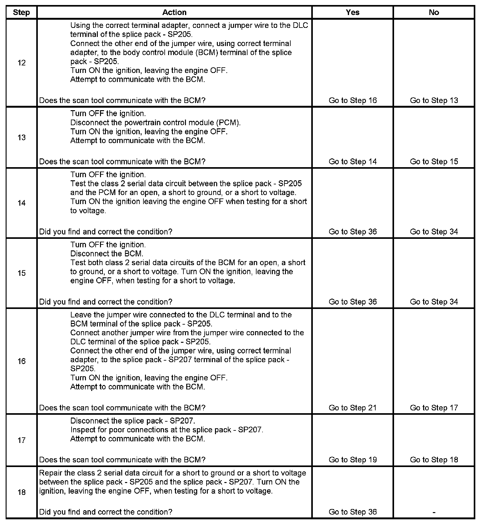 12. The class 2 serial data circuit is shorted to voltage or ground. The condition may be due to the wiring or due to a malfunction in one of the modules. When testing the wire for a short, make sure there is not a module connected to the wire being tested. This test isolates the BCM and the PCM class 2 serial data circuits.