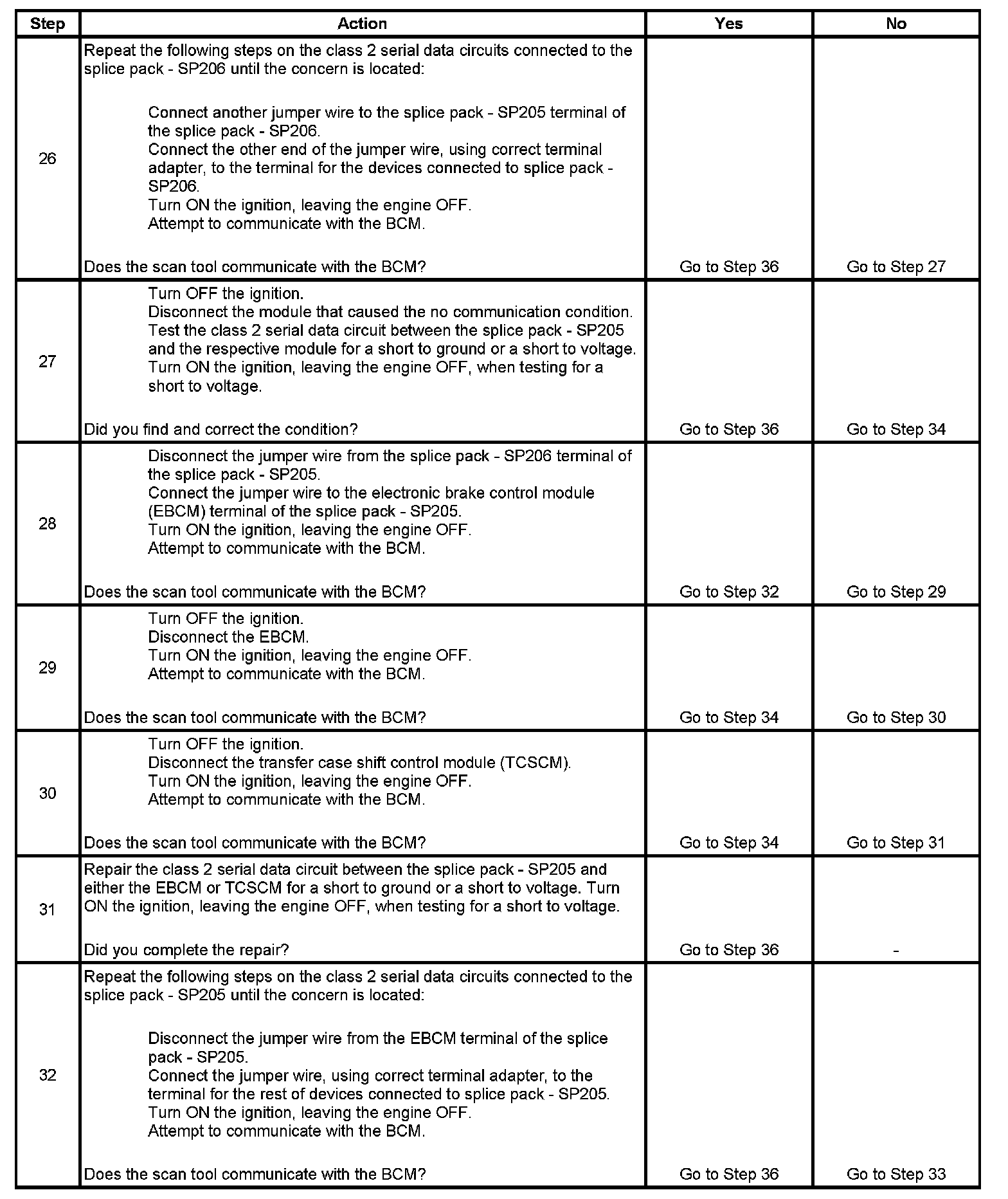 32. This test isolates the rest of the splice pack - SP205 serial data circuits.